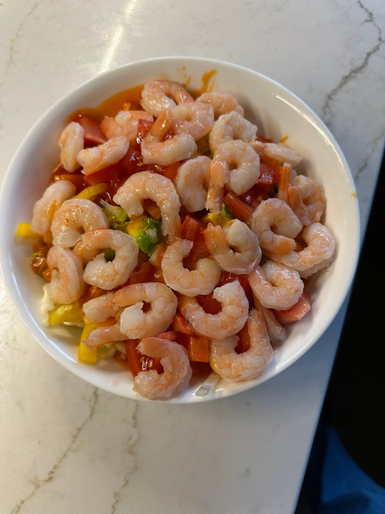 There’re 30 shrimp on there as well as 1 avocado, and 1 tomato. It was very filling.