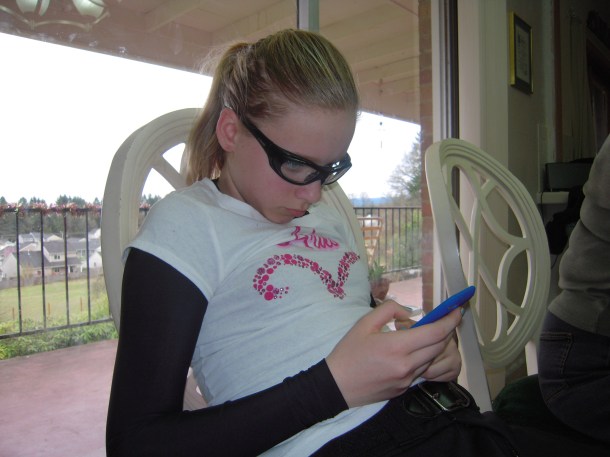 She’s ready for softball practice wearing her absolutely most favorite pair of glasses. Actually, they’re prescription goggles, and she hates them because “they look dumb.” All the adults in her life disagree.