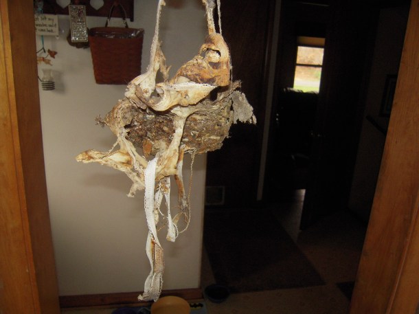 As near as we can tell, it’s a pair of women’s underwear from the early 60’s. The crusty parts are dead bugs. Pretty gnarly, huh? I asked Diane if they were hers and she denied it. Can’t said that I blame her which is why I predated them to an era before we lived here. She made me throw them away.