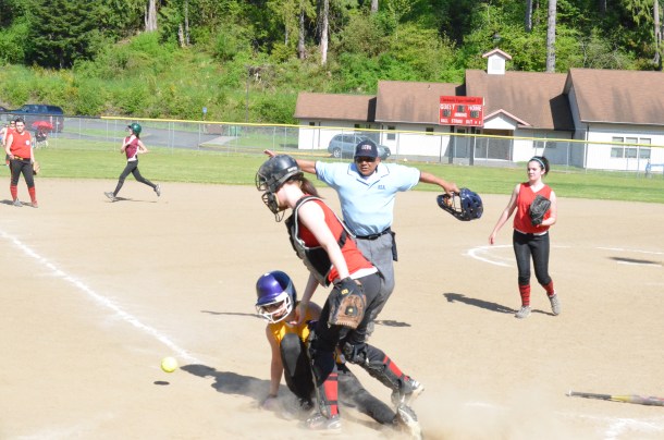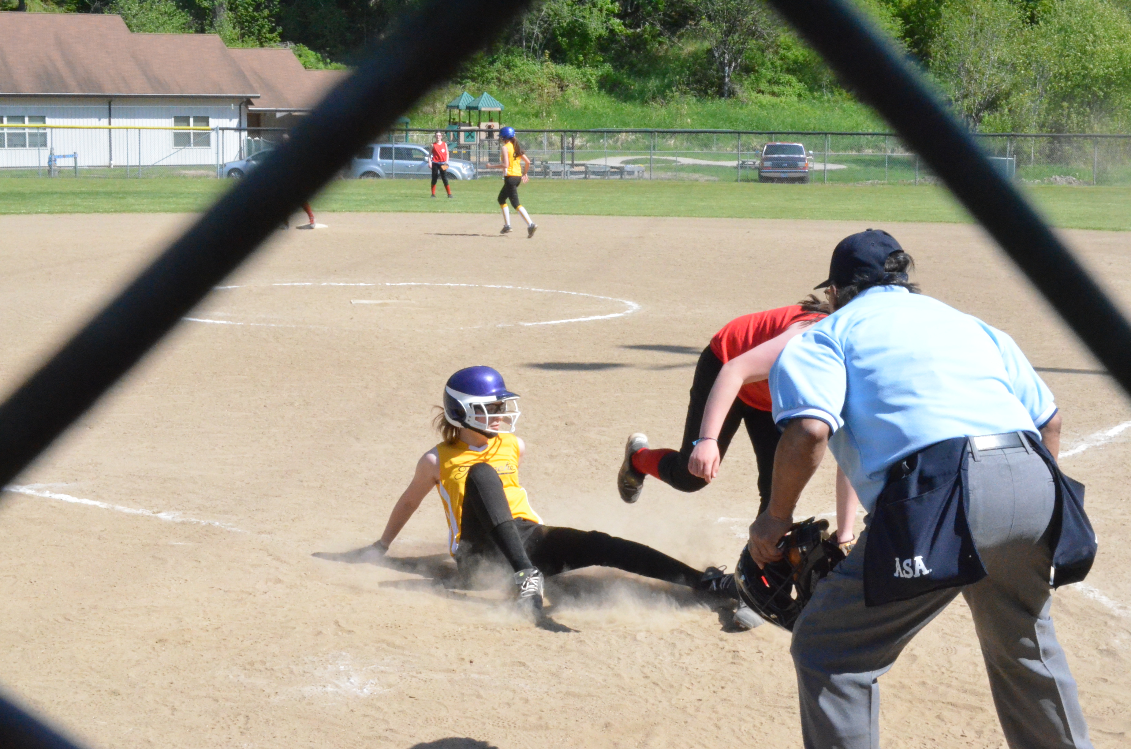 Sliding in at home – safe … though she didn’t get any hits today, she walked a number of times and got to do this slide a few times. Took out the pitcher on this one …