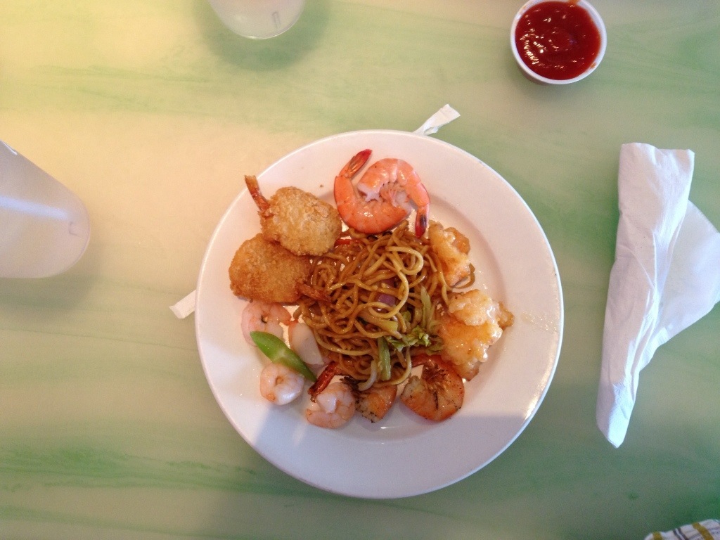 After church, we headed over to the mall where one of the 38 Wal*Marts in the area resides, and had lunch at the all you can eat Chinese Food Place. Tempting fate, I had six different kinds of dead shrimp, and a large glass of water. And noodles. I love those noodles.