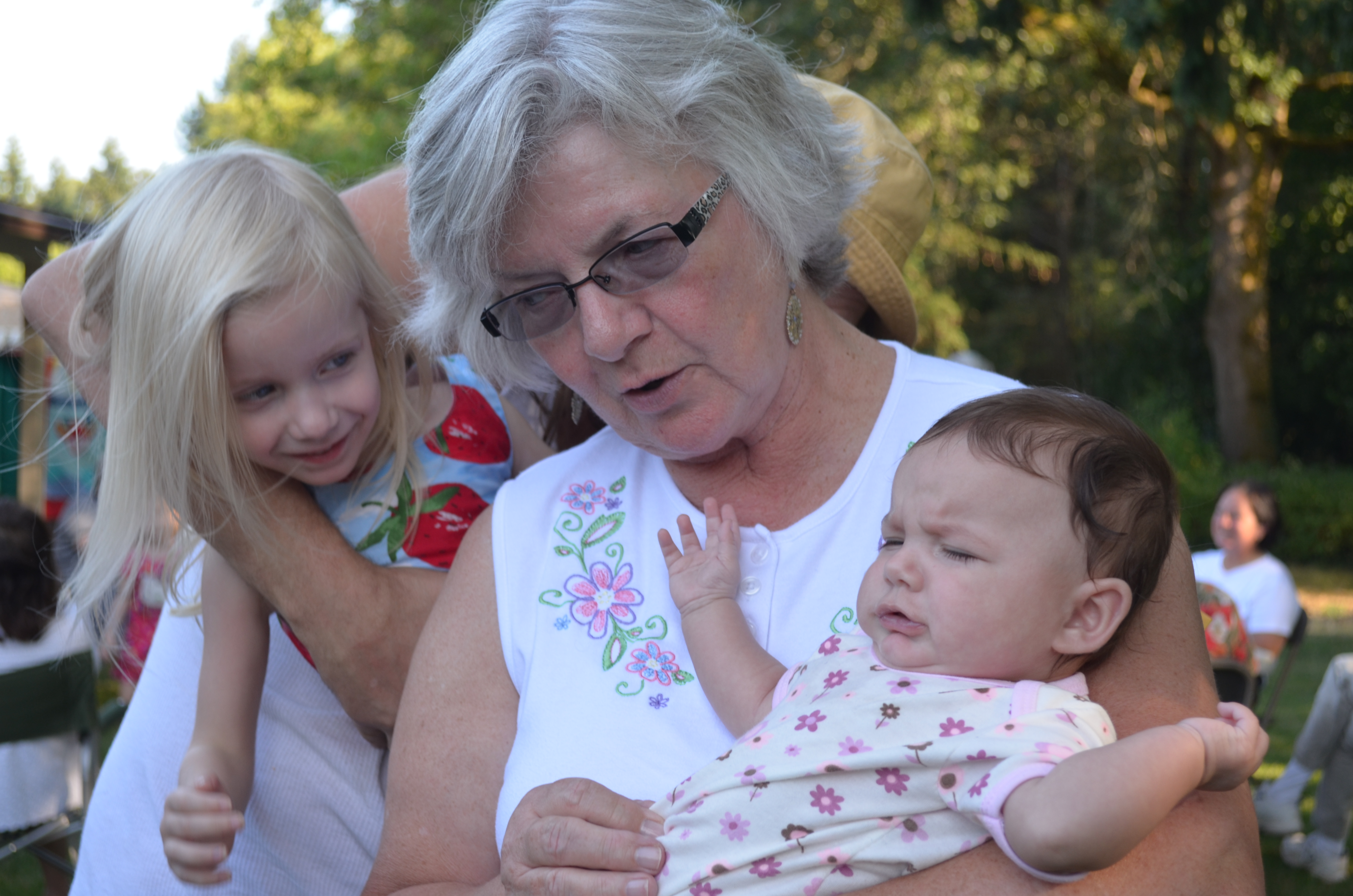 Since I didn’t get a picture of Diane at the party, here’s one of her holding her Great Granddaughter Juliett, with Juliett’s Aunt Baylee looking over her shoulder.