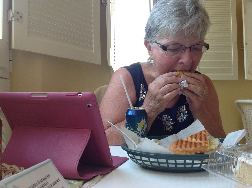 At this very point in time, we’re sitting at a table in the deli, eating our ham and swiss sandwiches, that was heated up like a panini. Here’s a picture of Diane eating here. She doesn’t know I took the picture, so I’m going to be in trouble for sure. But, that’s nothing new.
