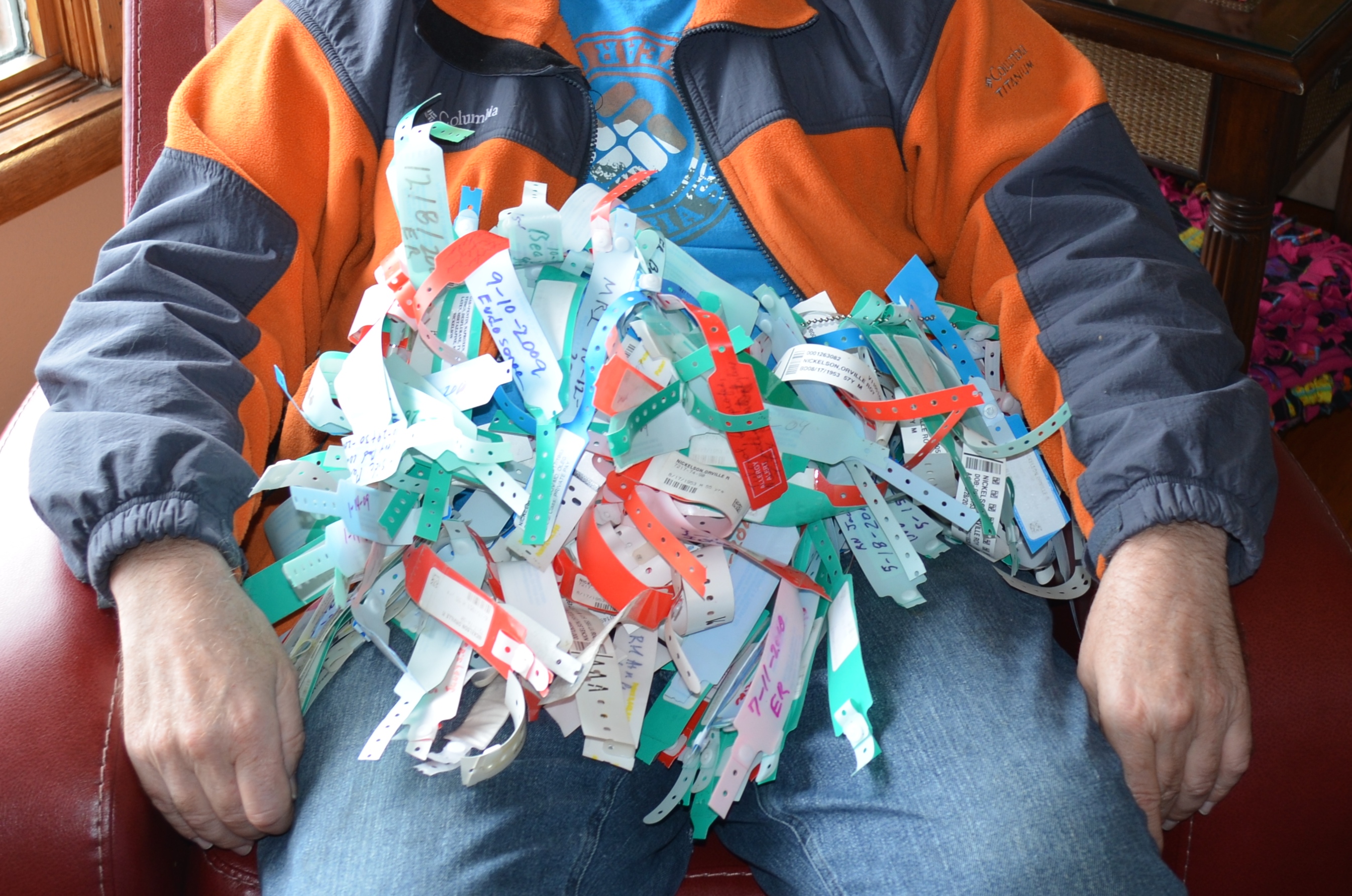 Nickie’s journey started with a fairly simple issue with his shoulder that escalated over a few years to a complex series of medical issues. That he’s relaxed, and pretty stress-free, speaks volumes about his fortitude. During this time, Nickie was admitted to the hospital a number of times as the result of doctor visits, and also because of emergency issues. He kept his wrist bands to document this tumultuous time in his life, and attached them to a metal ring normally used for making wreaths. He ran out of room so attached more of them to a long chain.
