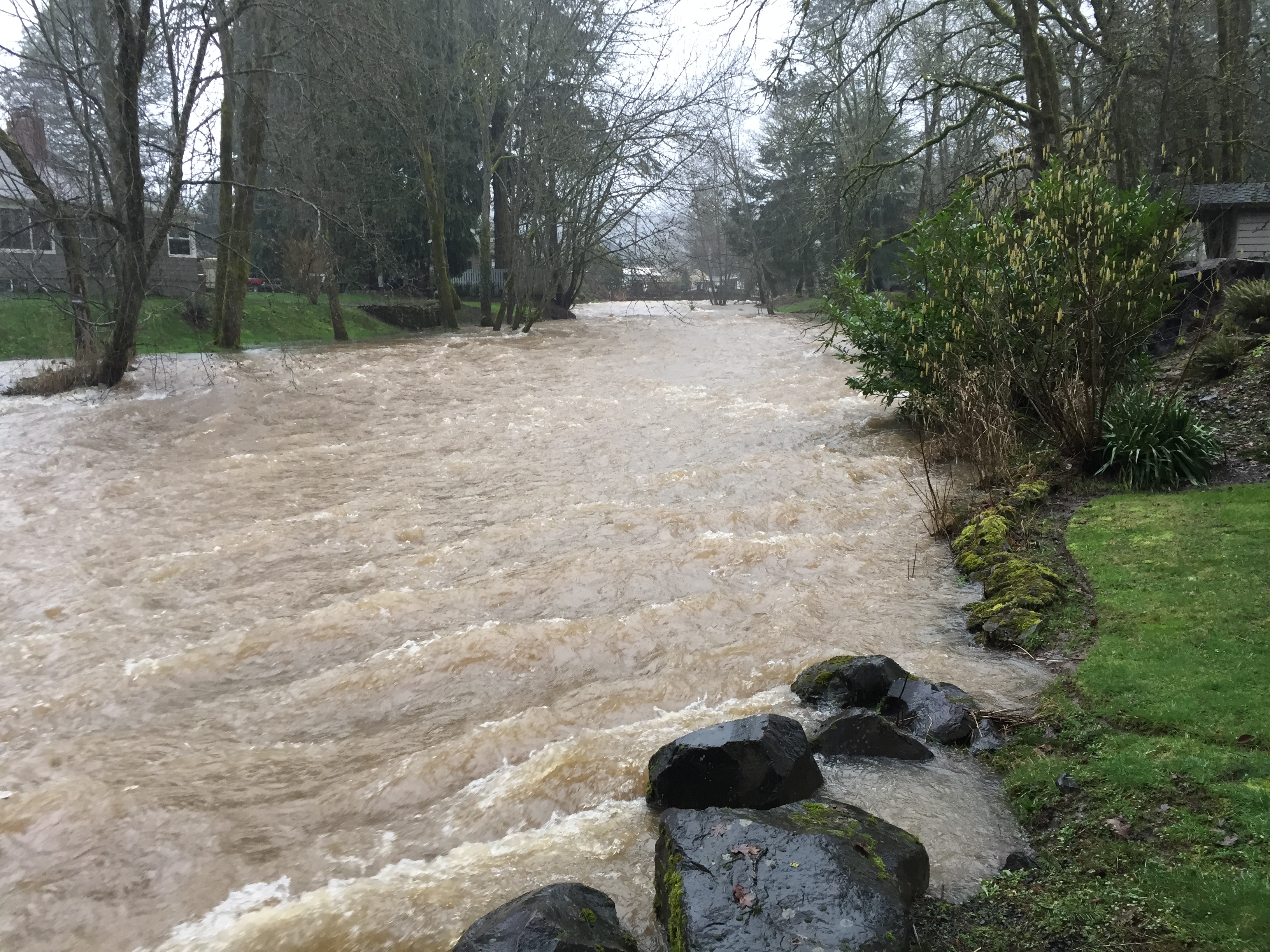Then we went back home to rescue the dogs, dropping Mom at her house on the way. Here’s what the rain has done to Milton Creek that normally runs peacefully through her back yard …