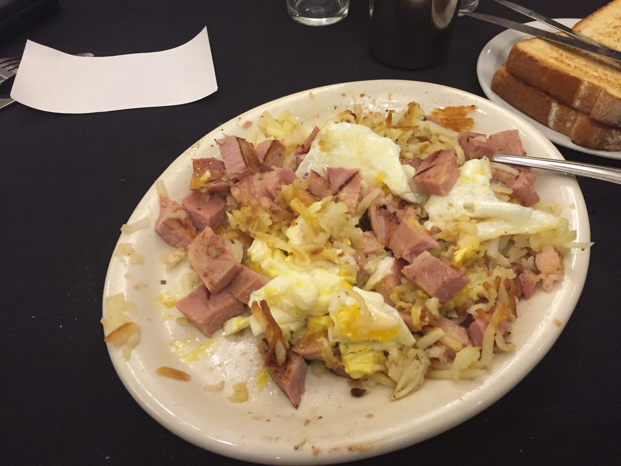 I got two eggs, over easy, a ham steak, hash browns, and two pieces of non-nutritional white toast. I had my own coffee from home so didn’t have to pay for that. When it was presented to me it looked really nice.