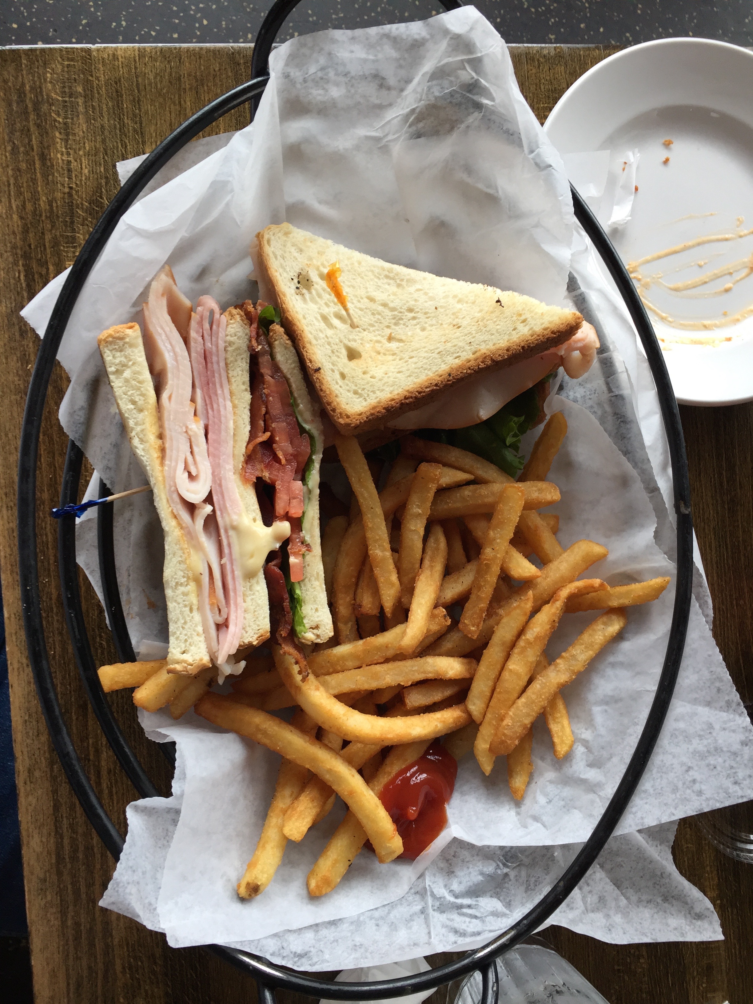 Inside HTH we were greeted by some very friendly folks who advised us to look around before making a choice. Actually, they didn’t suggest that. We just did it. They didn’t care. The front counter was the source of some incredible looking sandwiches, pre-made and ordered, and the back area was a walk-around counter containing yakisoba, fried rice, shrimp wrapped in bacon, coconut shrimp, lots of other meat choices (but I only focus on shrimp), broccoli chicken, and many other things. Just take what you want then get it weighed at the cash register and pay $8.95 a pound. Sounds expensive but Diane and I ate hearty for less than $20 and I had milk! It was all very good and we highly recommend HTH. I tried to find a web site for them but can’t. We were told it’s a new venue. Awesome!