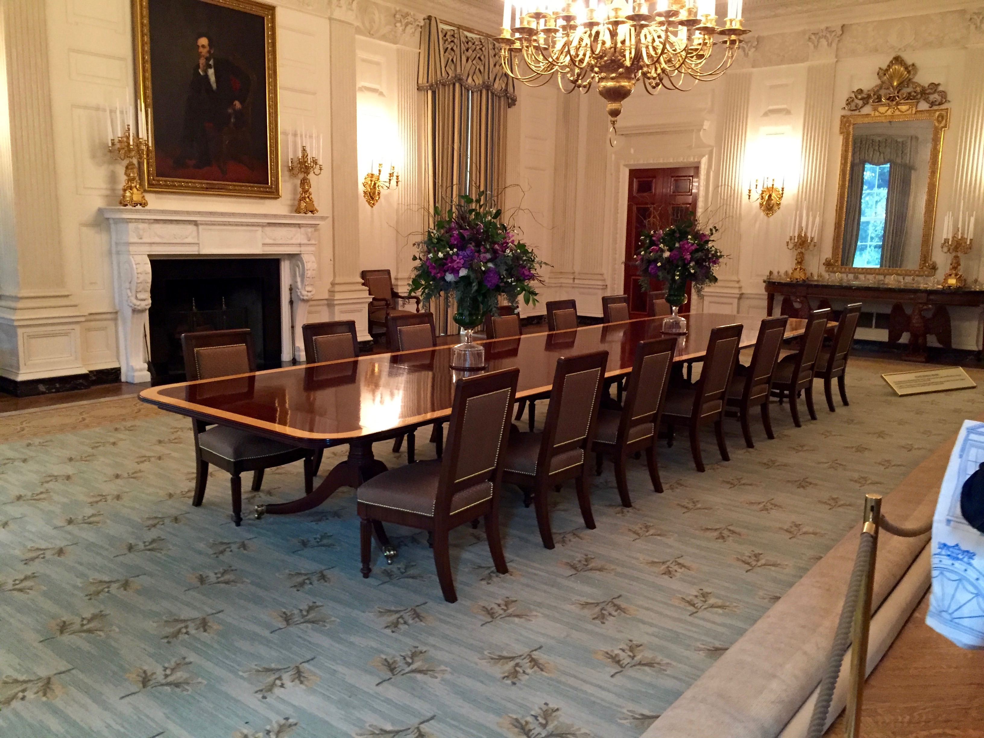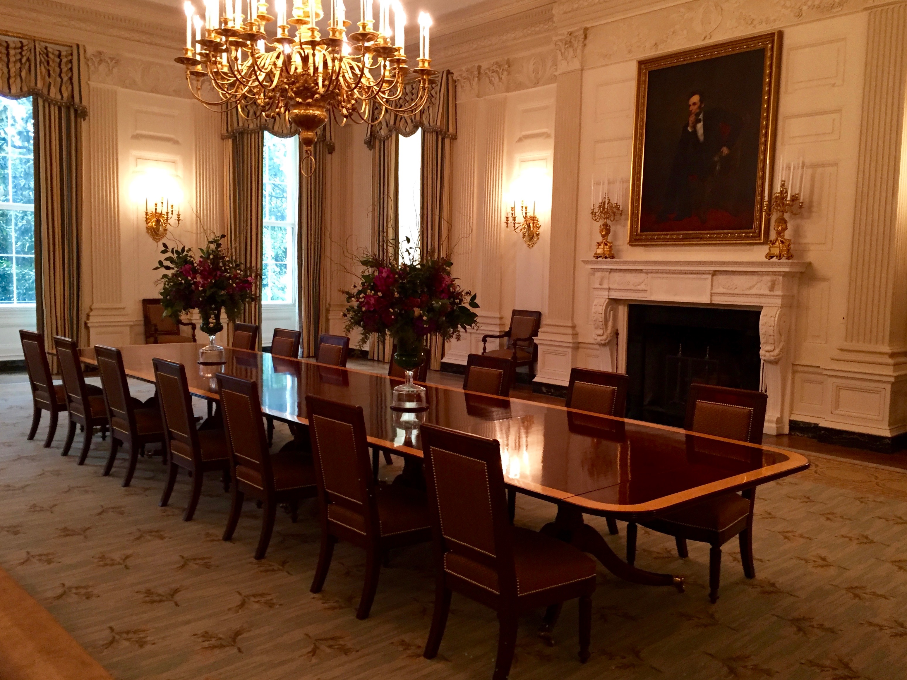 The dining room. Nice table, but I think the room would better represent America if none of the chairs matched, don’t you?