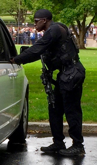 As we departed down the driveway I spied this Secret Service agent conferring with another one. Having a bad ass like this on my side gives me goose bumps. He’s the only agent I saw that was dressed totally in black. All the others had white shirts under their vests. I figure this gentleman must be one of the stealth versions.