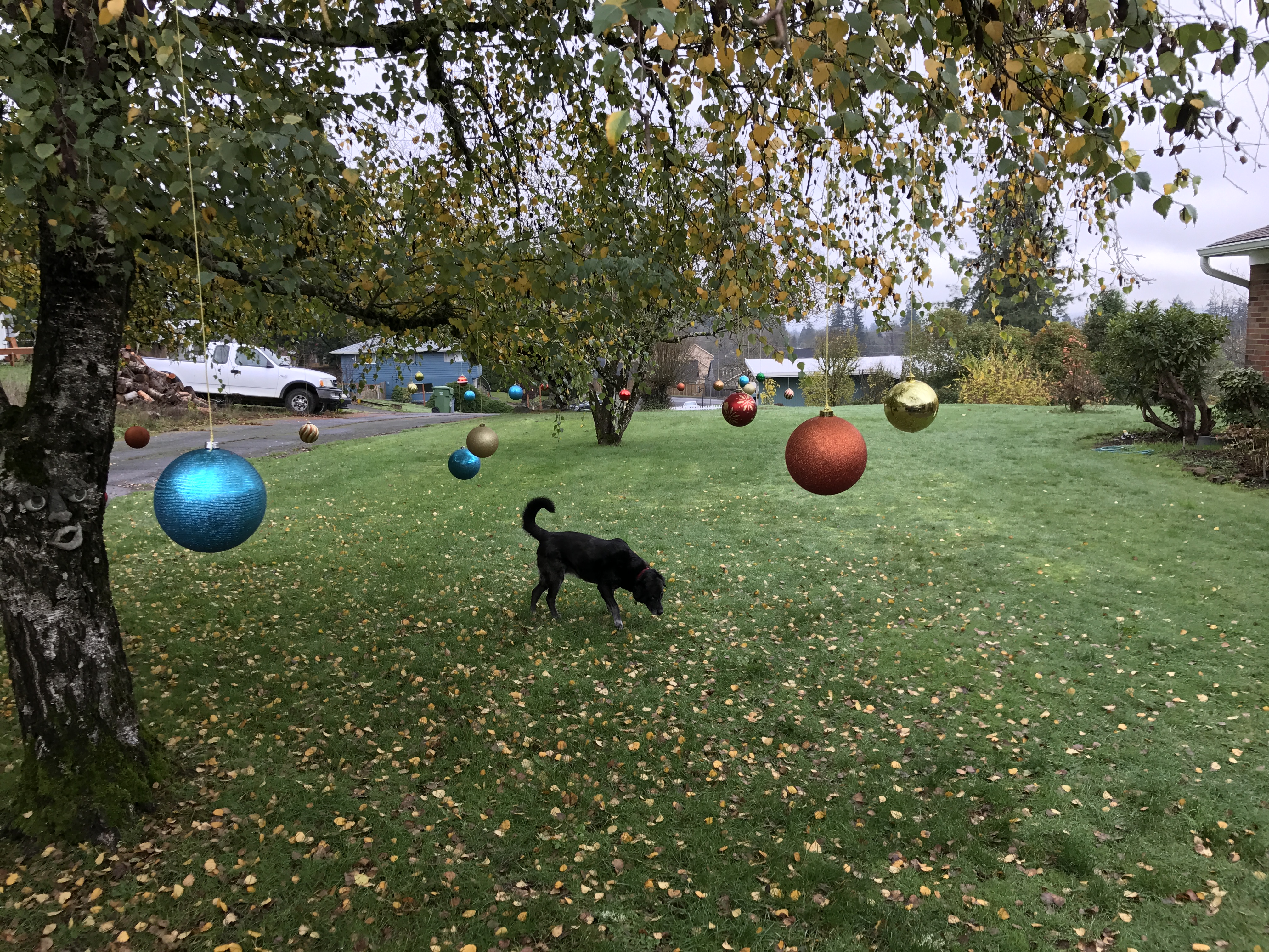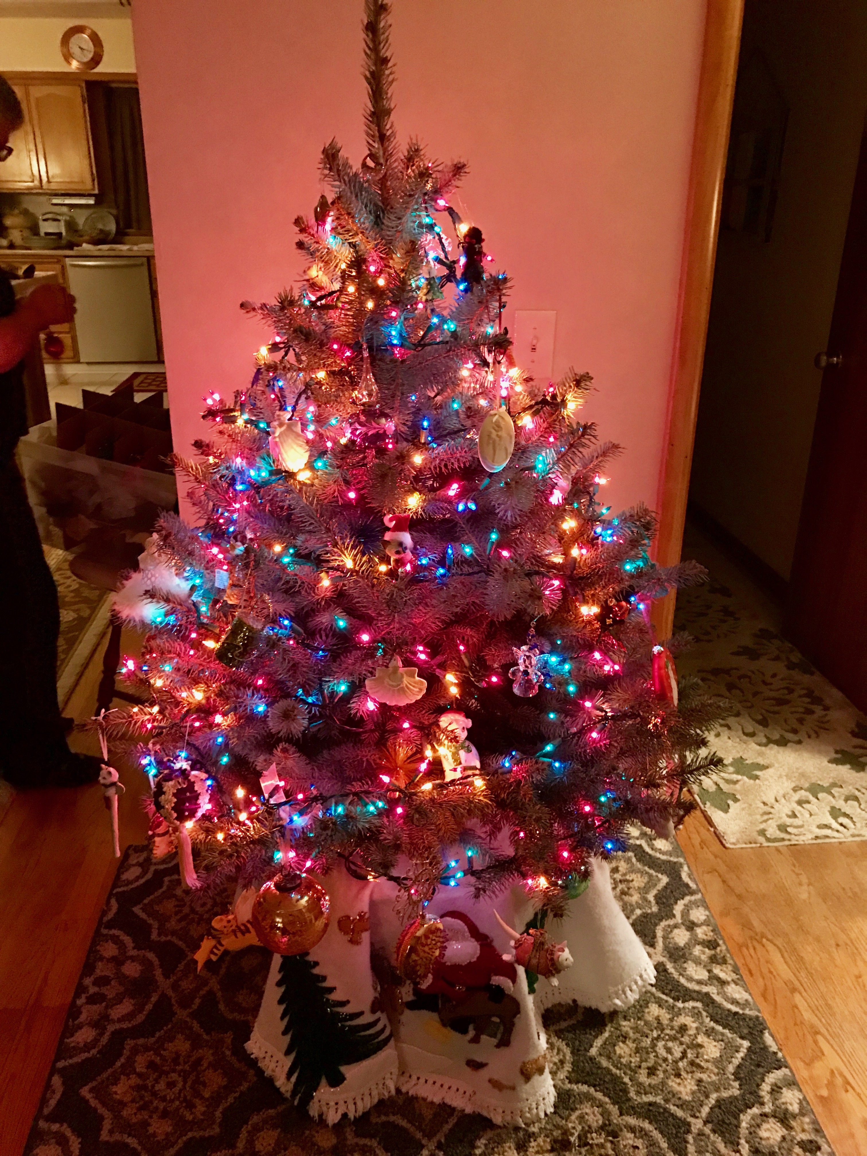 Then we got busy getting the tree ready for the house. This involved removing a very large plant from a very large pot so we could transfer the tree from its pot to the nicer pot that’s more suitable for indoor use. We’ve had the tree for about a week and it’s been sitting in the yard soaking up as much rain as it could. Consequently, it weighed a ton which was almost too much for me to lift from one pot to the other. But, I did it. Then we took it inside using a hand truck. Getting it off the hand truck proved to be problematic and resulted in me making a huge mess when it tipped over. Dirt everywhere. But, it cleaned up nicely and resulted in this once Diane got all the lights and ornaments attached. After the New Year the tree will be replanted in the lower yard where it can just grow as long as it wants to.