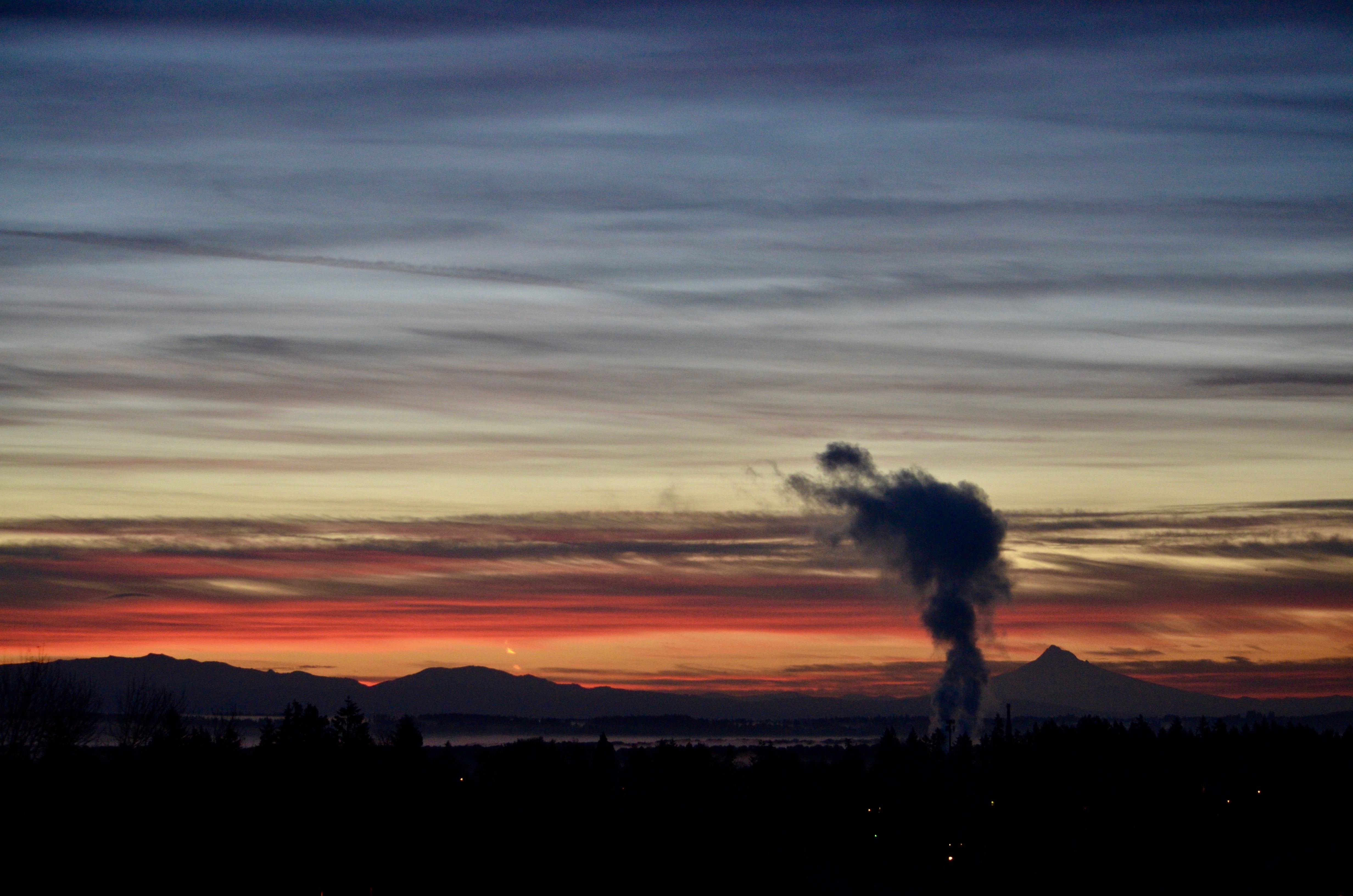 Then we have a sunrise view looking toward Mt. Hood. I haven’t figured out what makes all the smoke every morning, but notice that it’s not there during the afternoon.