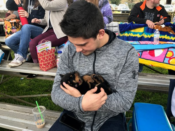 And that pretty much covers the trip. The puppy slept through the 5 hour trip, interrupted by a couple of softball games during which he was adored, and held, by all the pretty girls who walked by. Guys seem to be more immune to puppy cuteness than girls.