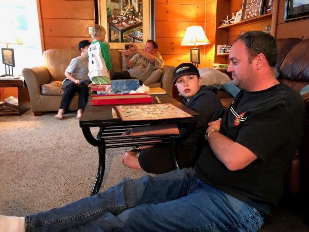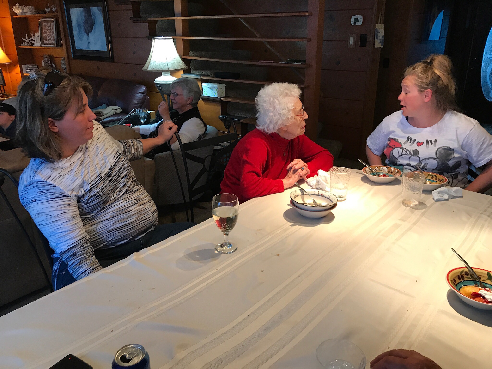 As a bonus, almost all of Kevin’s family were there, also. What a surprise. Including Kathie and Kevin, there were thirteen of them: Will, Casey (Kevin’s daughter), Wyatt & Gracie (Will & Casey’s), Jason, Rhonda (Pam’s daughter), Cody & Colton (Jason & Rhonda’s), Danny, Pam (Kevin’s sister), and Cam (Kevin & Pam’s Mom). Cam, incidentally, is 95, and a fun lady. The reason for this family gathering was the semiannual hand off of Cam from Kevin & Kathie to Danny & Pam as she transitioned from California to Washington. It’s a special event and we felt blessed to have been invited into Kathie’s new family to share it.