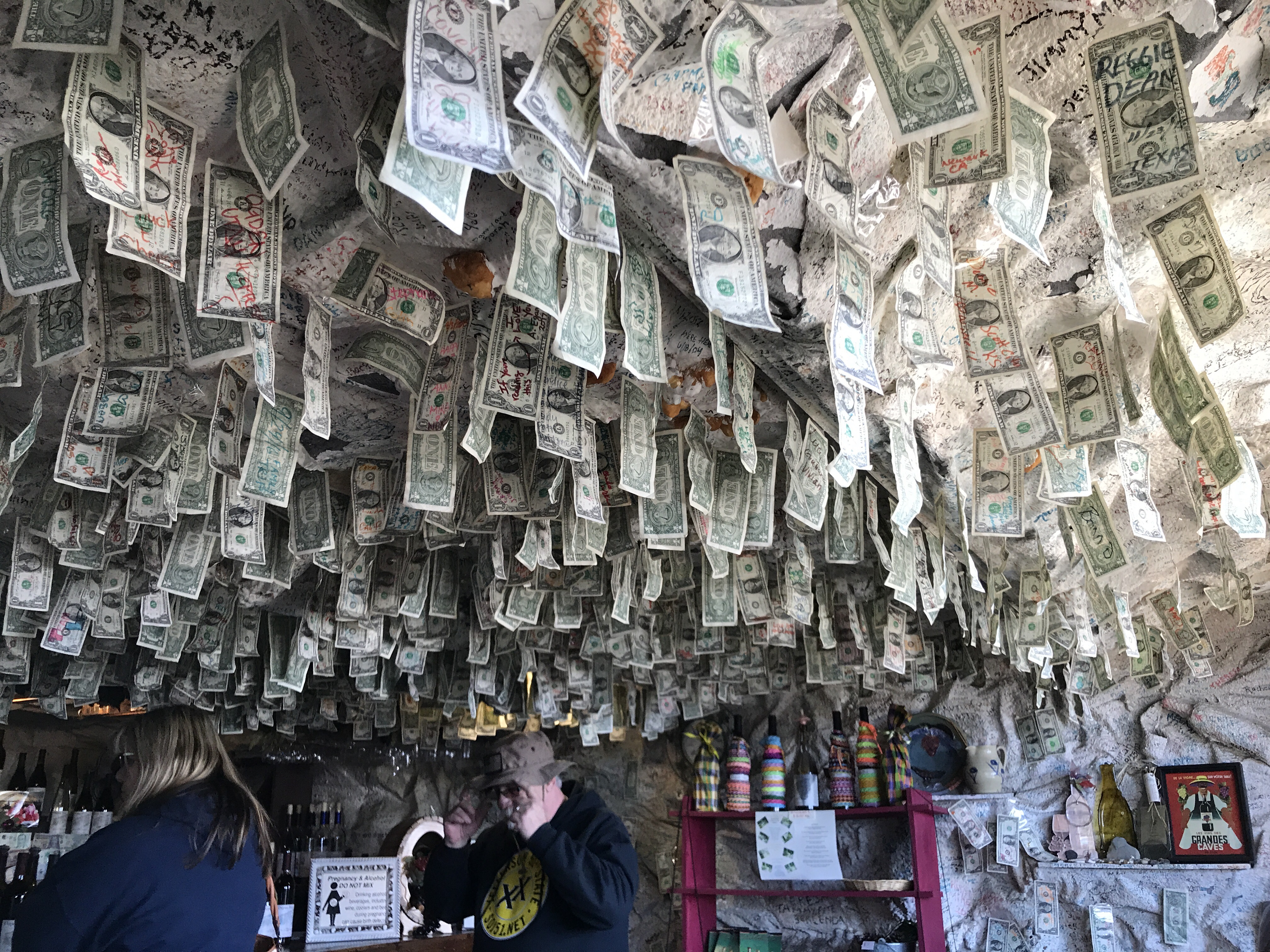 Upon entering the tasting room potential customers are greeted by a low ceiling with dollar bills taped all over it. The story, according to the wine steward on duty is that the dollars are removed once a year and the total is matched as a donation to charity.  Pretty nifty.