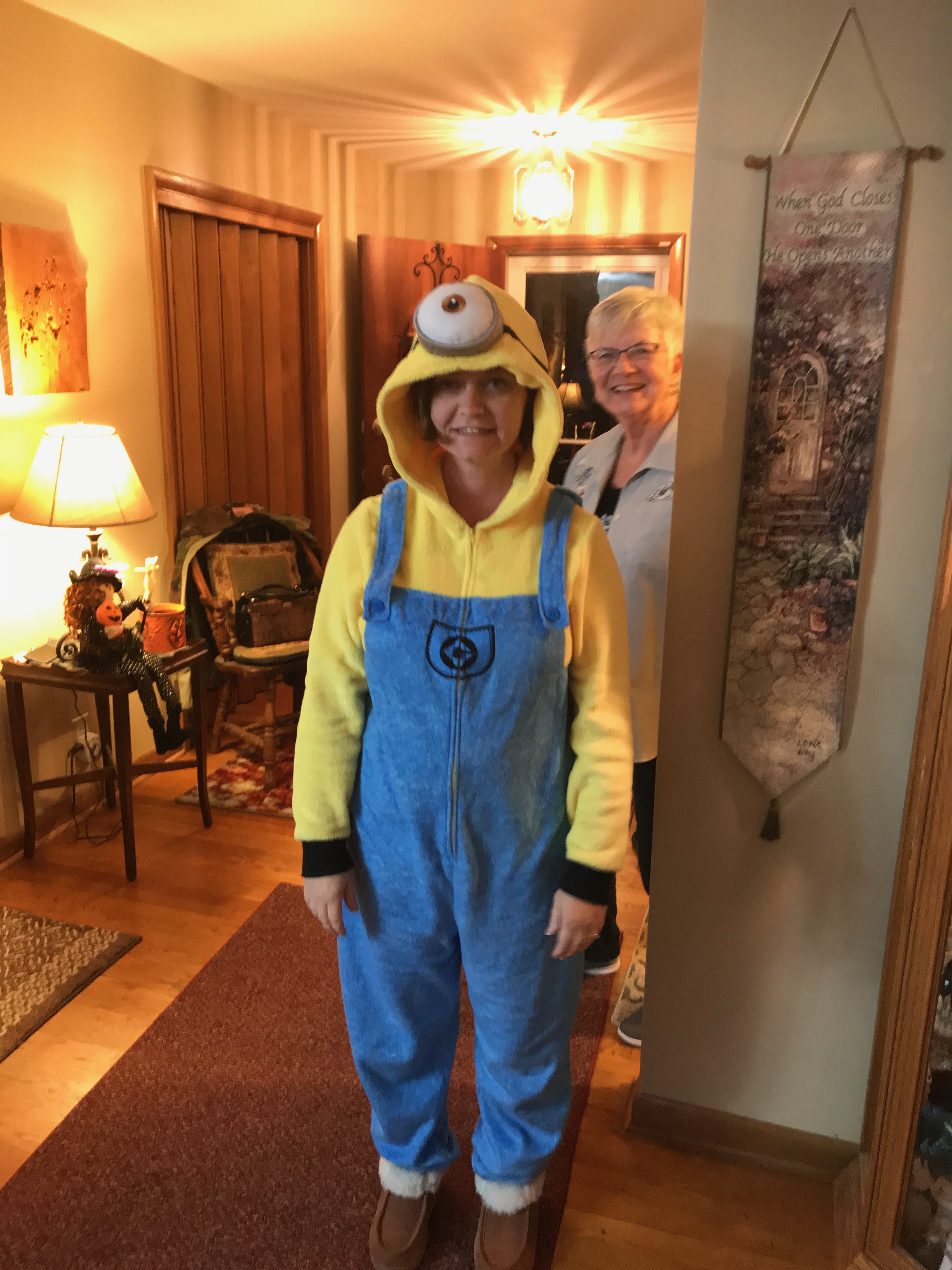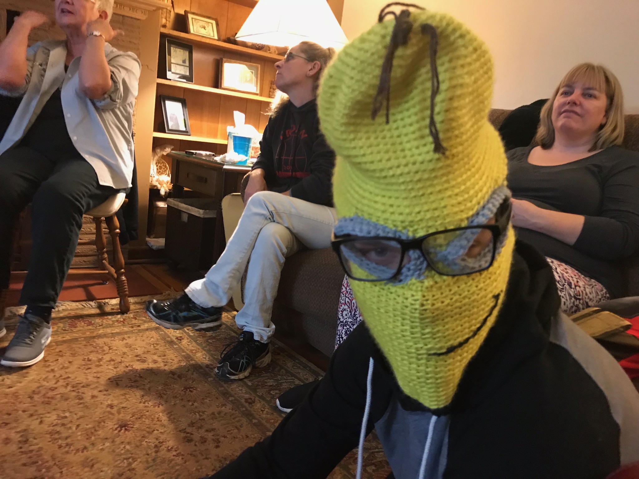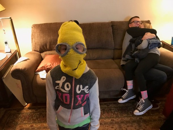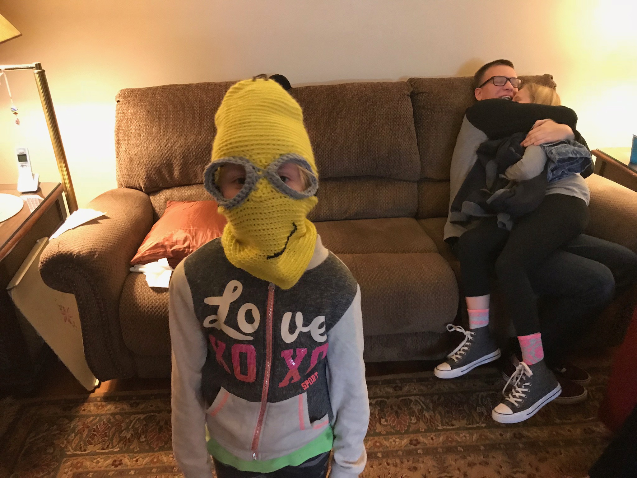 The minion ski hat was my contribution. Diane found the pattern and suggested that I make it, so I did. I still had the stitches in my thumb at the time so crocheting was tricky because the my stitches tended to get tangled up with the minion hat stitches.