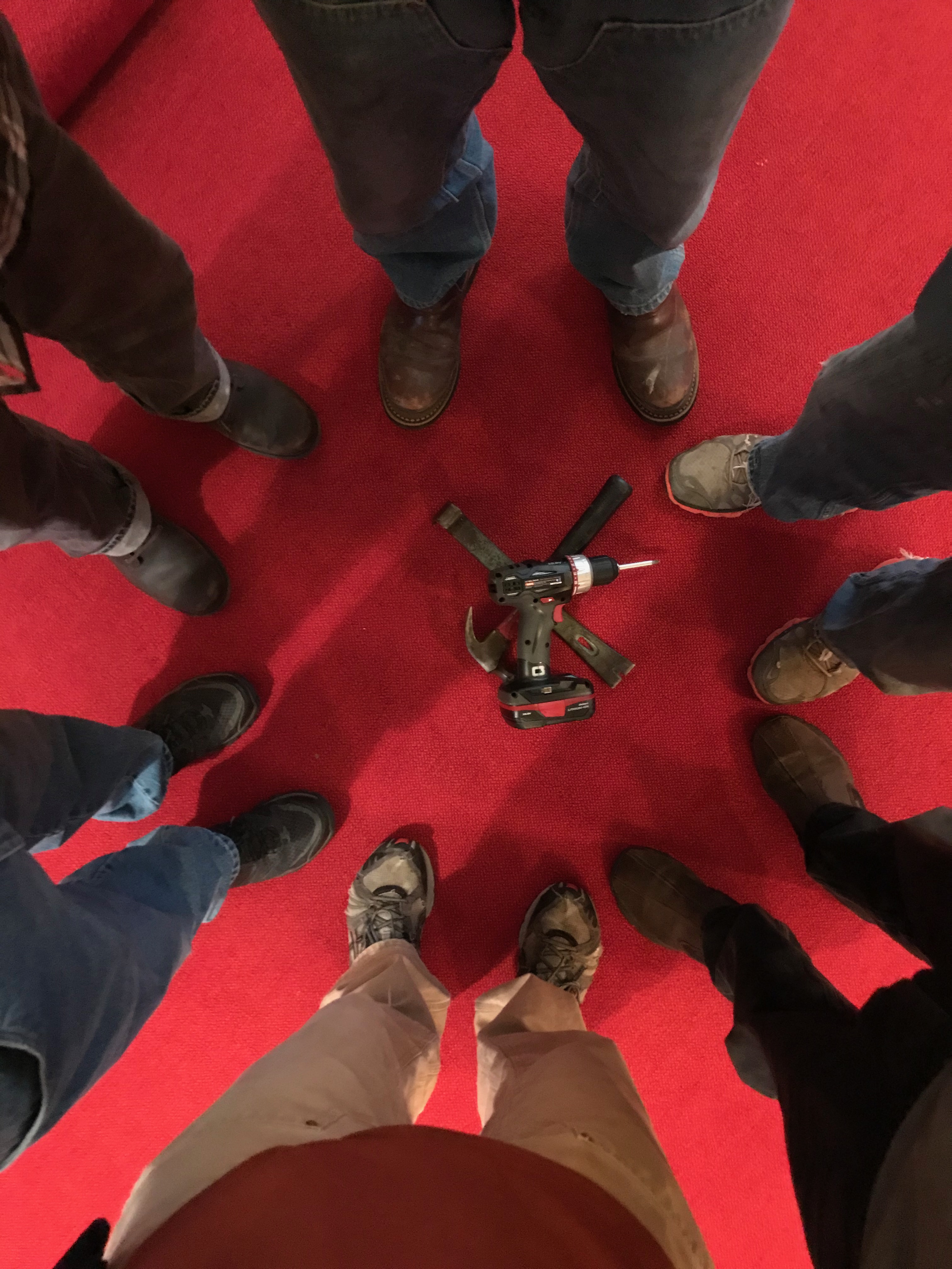 To commemorate this effort, we took a couple of photos using those taken of the iconic PDX carpet, before it was replaced not long ago, as an example of how to properly make it special. I’m not sure that was accomplished, but we had a bit of fun doing it. The tools were necessary to unbolt the pews from the floor. Not all the bolts came out willingly.