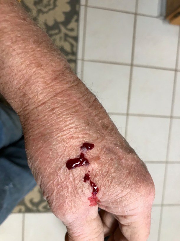 She immediately got up and escorted me to the first aid room – we have one of those, now – and fixed me fight up with just one band-aid because two of the small punctures quit bleeding when I scrubbed up so we just left them alone.