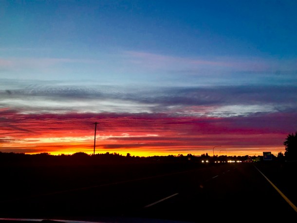 Last Sunday Diane and I took a trip to Bremerton, WA to deliver Cedric back to his ship, the USS Nimitz, America’s oldest super carrier. We didn’t leave until 2000 so it was a quiet and uneventful trip. We were treated to this sunset as we made our way north which made the trip worth it all by itself.