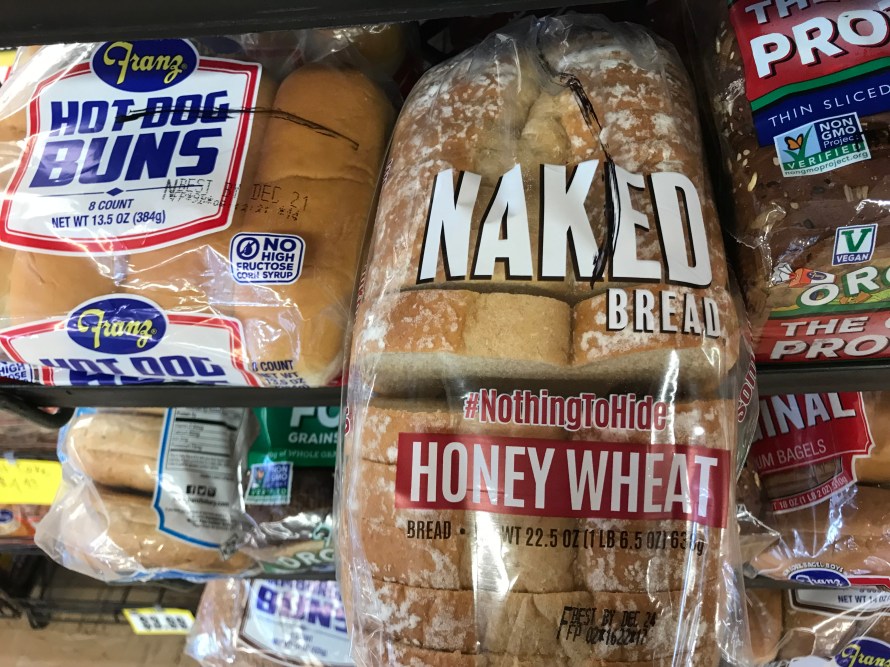 Kind of interesting, we thought, so we got some. My guess is that some politically correct group objected to the Bimbo brand and caused the bread people to come up with this as a compromise. It’s pretty good bread, but I feel exposed when I eat it.