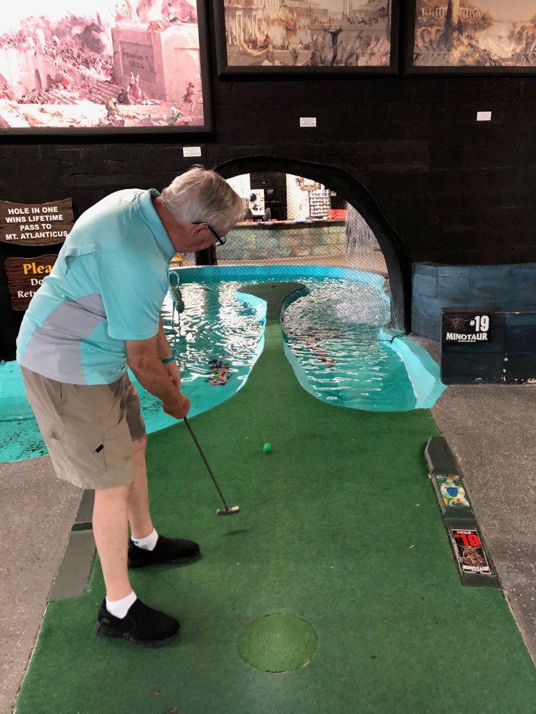 No doubt you gasped when you realized I was talking about putt putt golf, not real golf. The thing is, if you think about it, me being an unemployed, retired, old navy guy means that $10 for 18 holes of putt putt beats real golf green fees that range from $28 to $80+. I don’t know if that’s for 9 holes or 18, but putt putt is cheaper and I’m cheap. That, and it was Diane’s choice of which course to play.