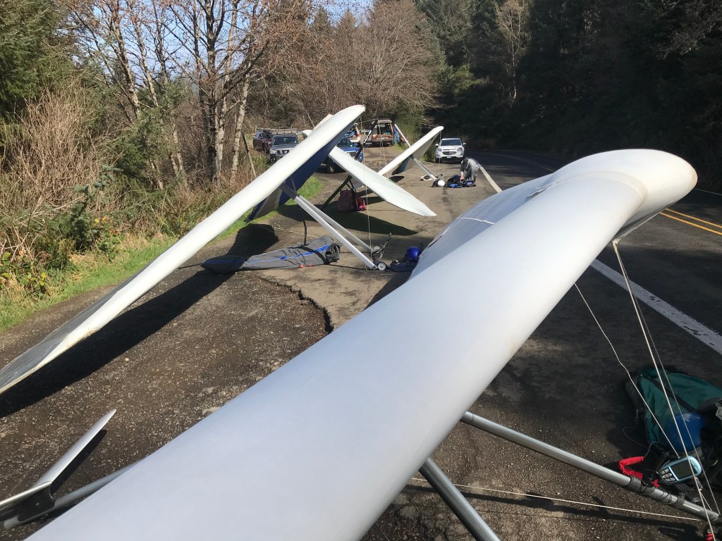 One day we headed South toward Pacific City. We came around a corner and encountered what I initially thought was a plane crash (really) but it was just a bunch of hang gliders getting ready to launch off the hill toward Lookout State Park. The above photo is the view they have as they run down the hill to get enough air to lift off.