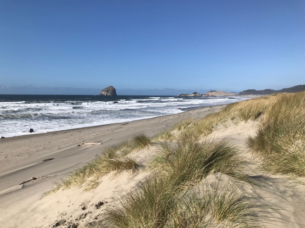 For folks who are a little familiar with the Oregon Coast, you may find the interesting. It’s group of three rocks at the southern end of Lincoln City that are normally (when I’ve seen them) surrounded by water. The locals have a name for them, but I can’t remember what it is.