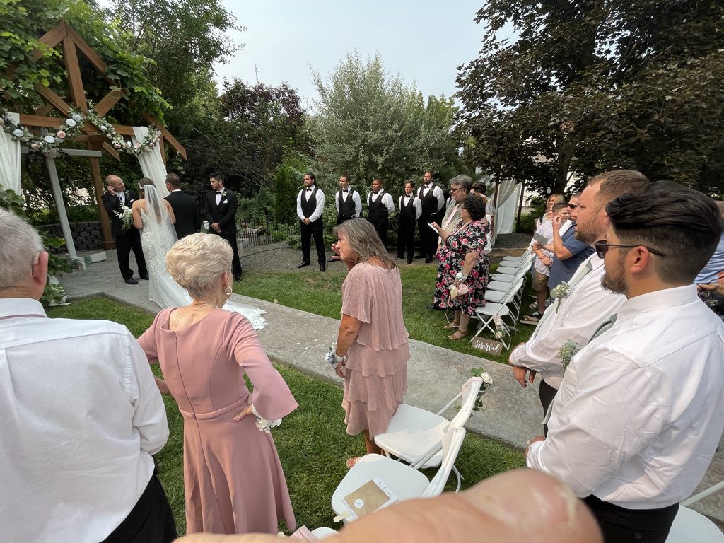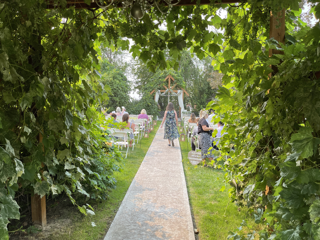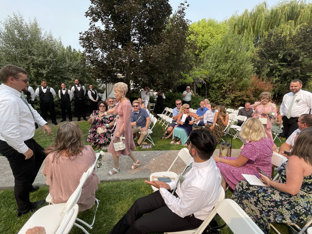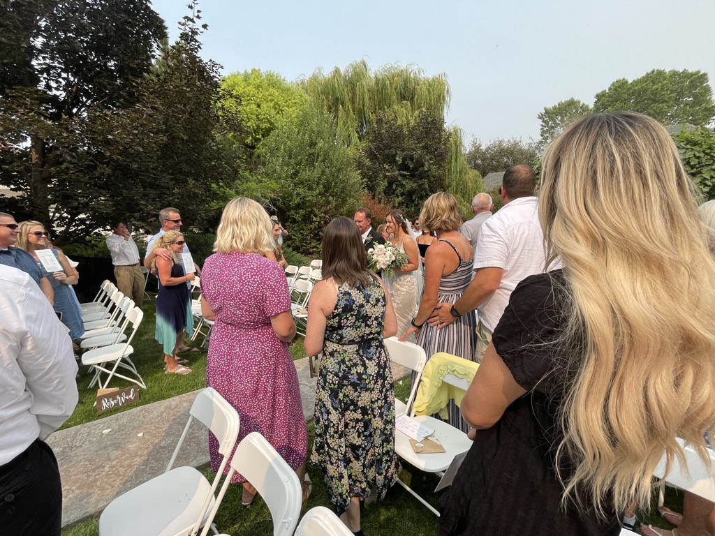 The wedding took place at a very stunning outdoor venue that was created just for this purpose. Not just this wedding, but anyone who wants a wedding in a stunning venue. The date was chosen based on weather predictions about when the hottest day of the year was likely to descend on Nampa. I must say, they nailed it. It was very hot. Thankfully, there was a little hand fan on each chair to help with the heat. Daniel, brother of the bride, escaped to the shade of a tree and kept his tiny little daughter (Edith) cool with a battery powered fan. Everyone else just had to sit there and sweat.