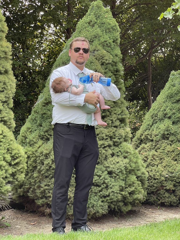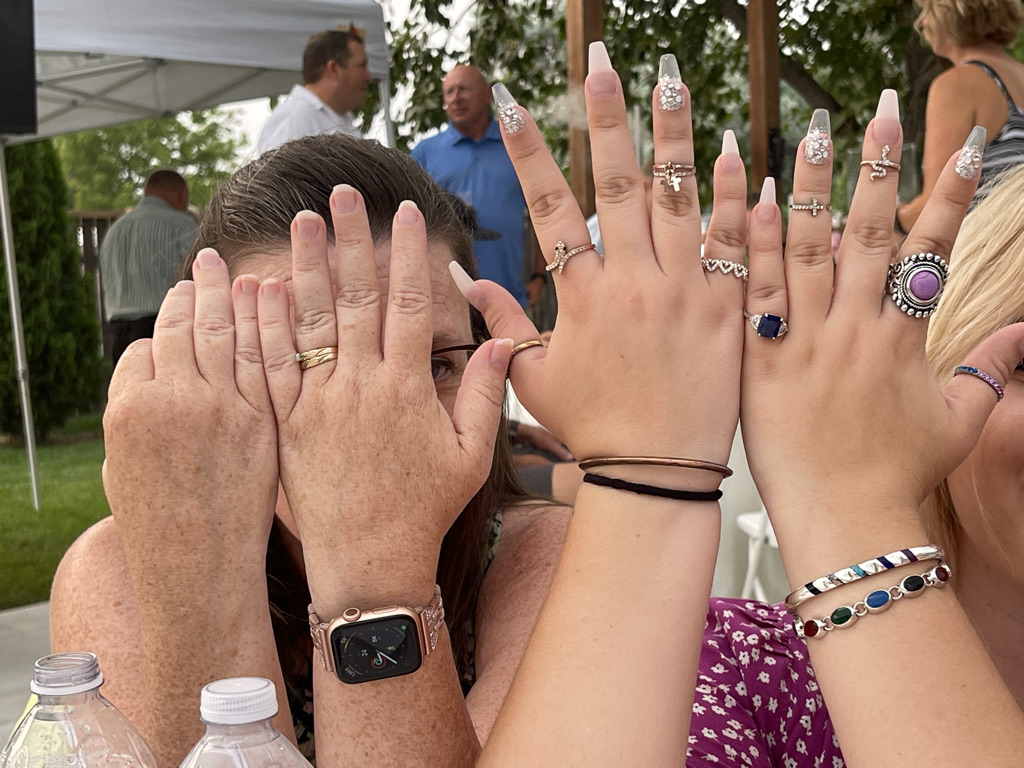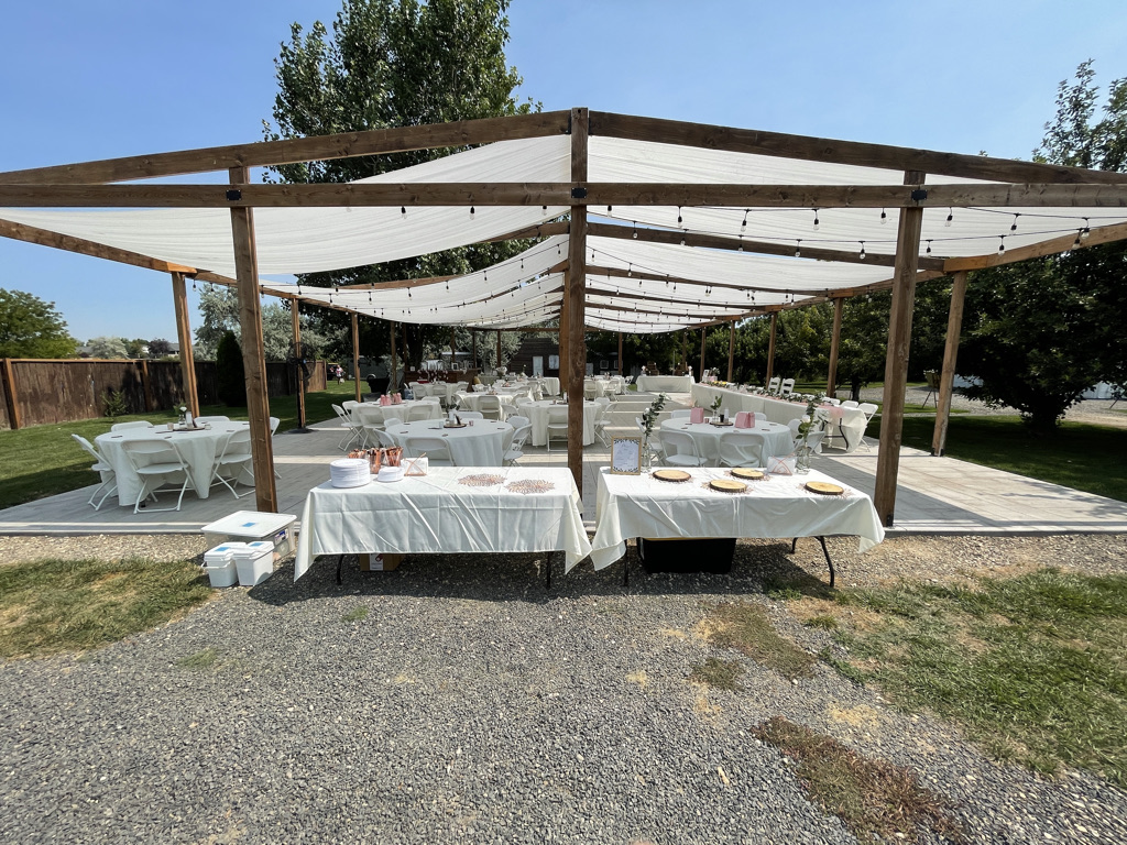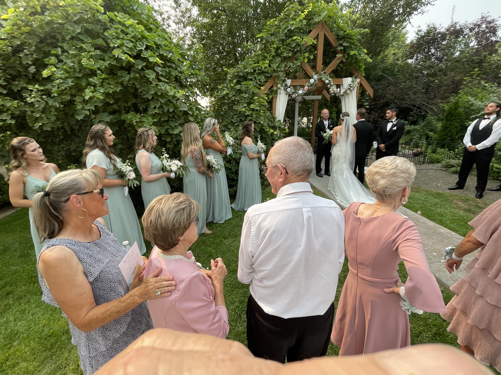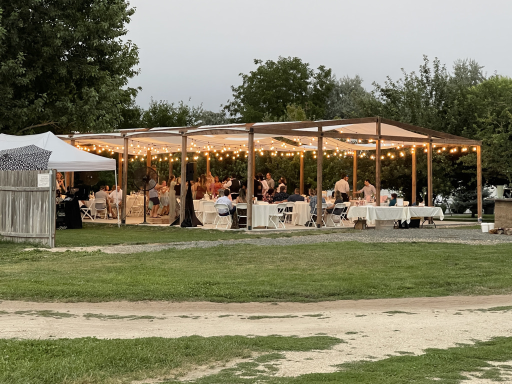 The wedding took place at a very stunning outdoor venue that was created just for this purpose. Not just this wedding, but anyone who wants a wedding in a stunning venue. The date was chosen based on weather predictions about when the hottest day of the year was likely to descend on Nampa. I must say, they nailed it. It was very hot. Thankfully, there was a little hand fan on each chair to help with the heat. Daniel, brother of the bride, escaped to the shade of a tree and kept his tiny little daughter (Edith) cool with a battery powered fan. Everyone else just had to sit there and sweat.