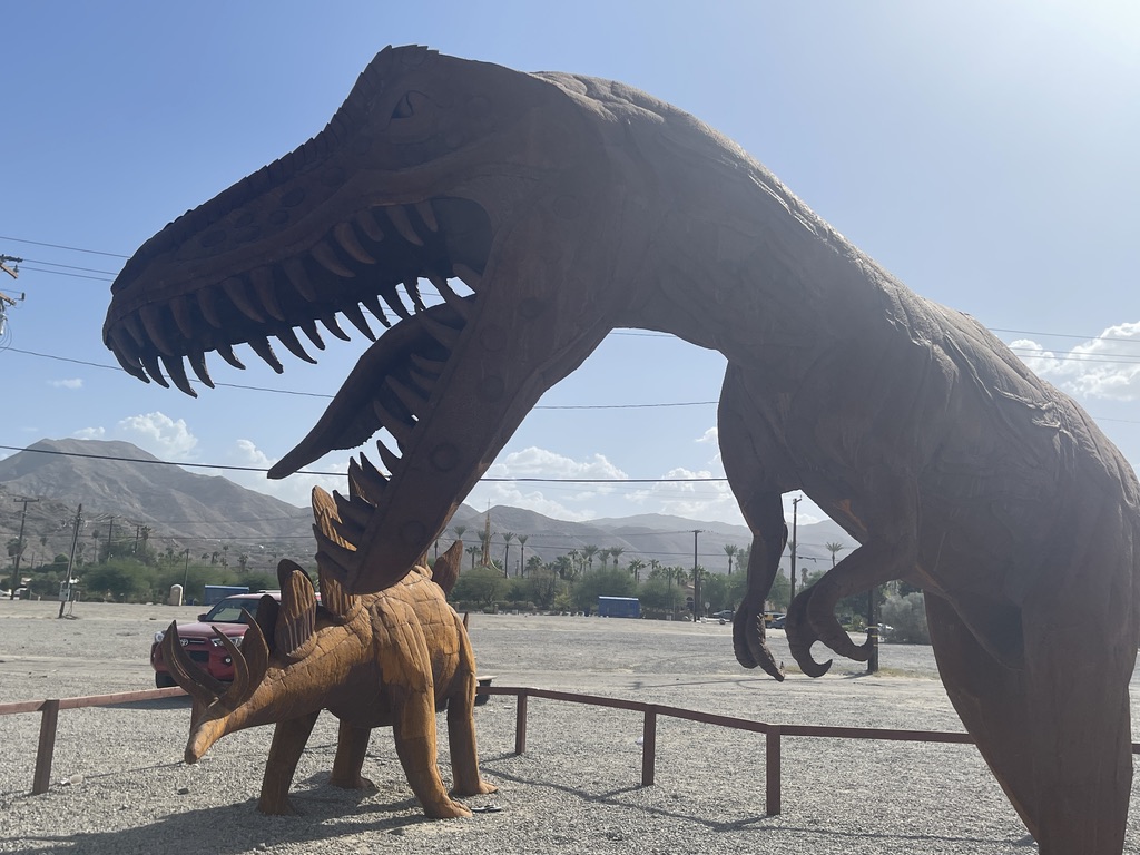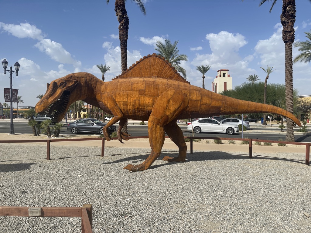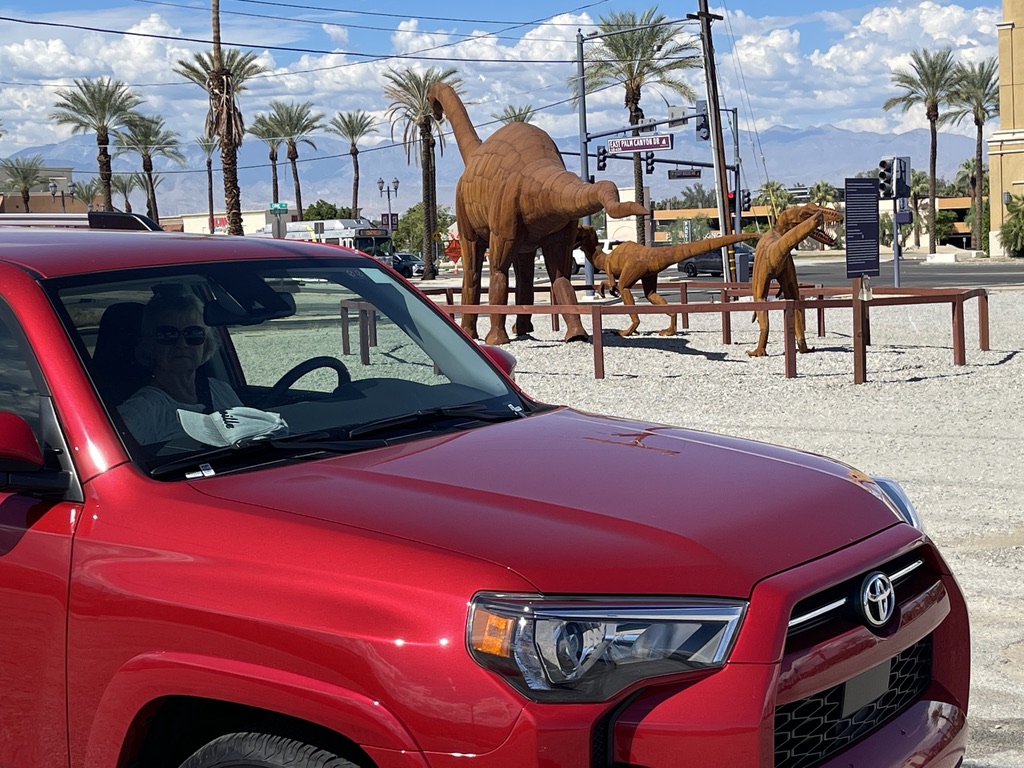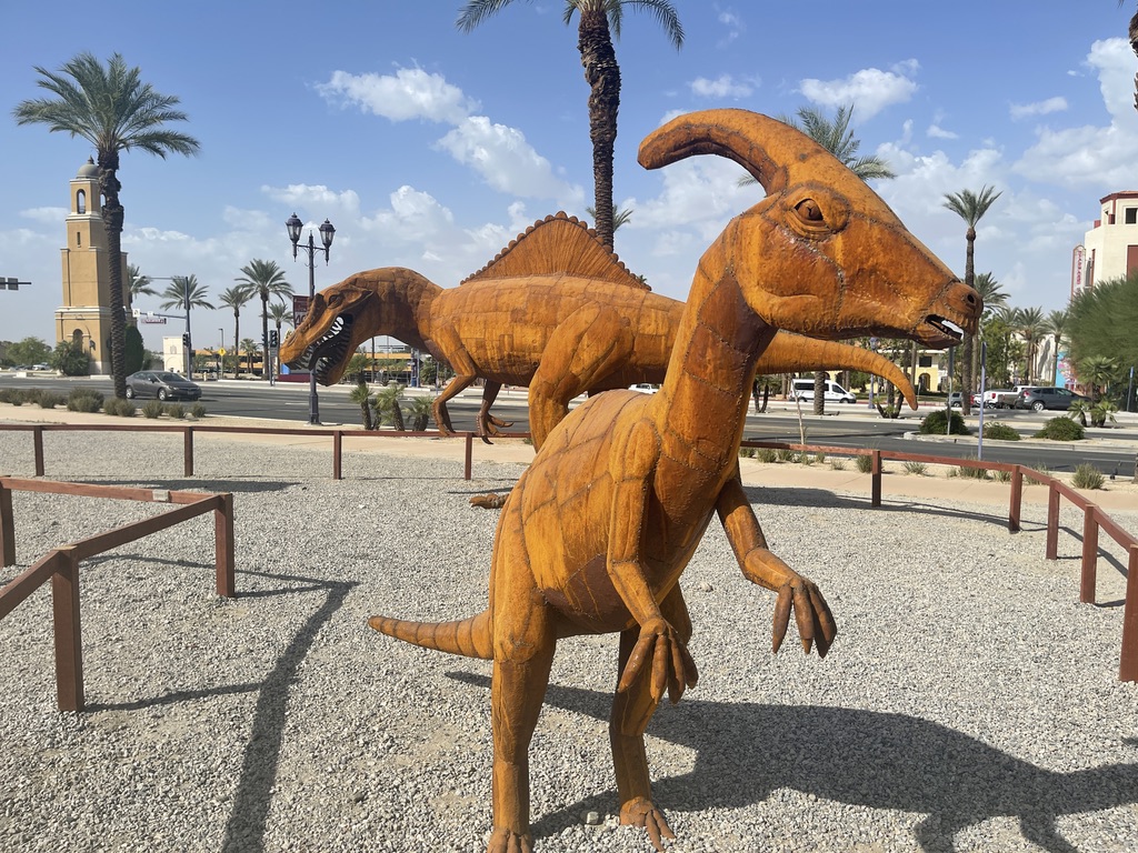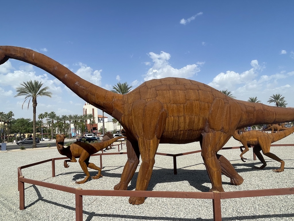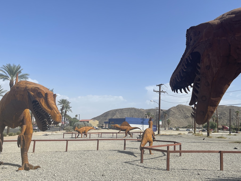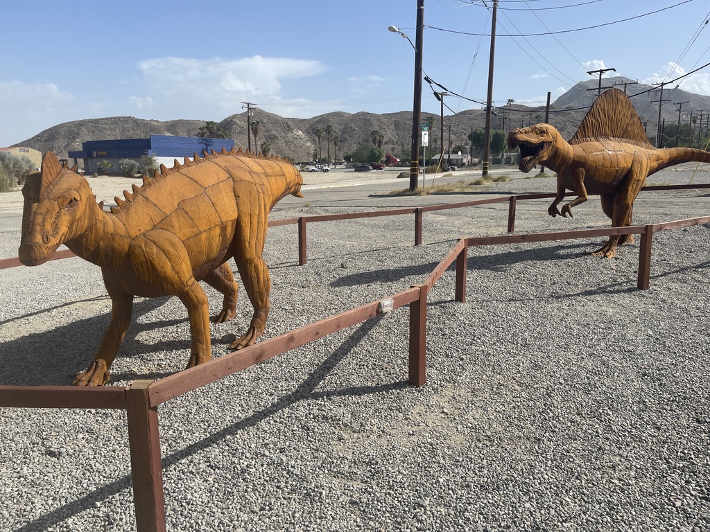 Along one of the streets Palm Springs is a very large lot that hosts a display of about 17 dinosaurs made out of metal. Knowing that there are some little people in our family who really like those things. So, this is for them, and for everyone else who find joy in these critters. All I have are photos for this. No narrative.