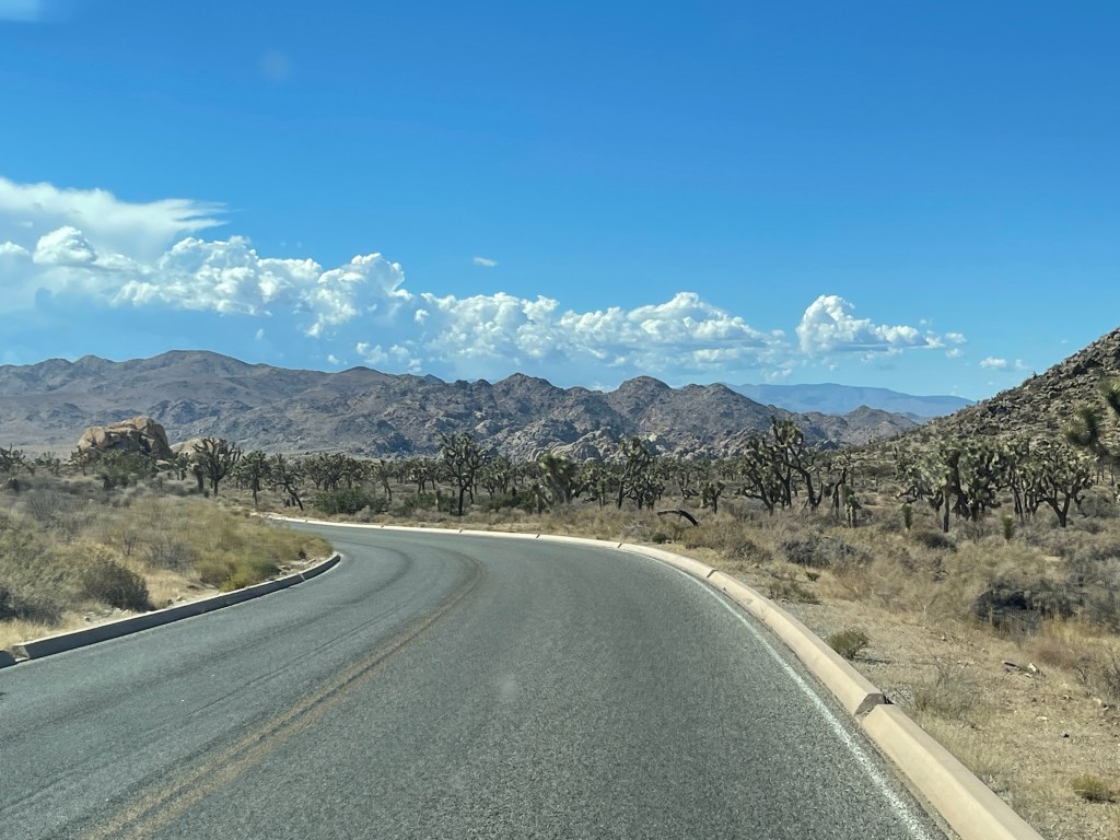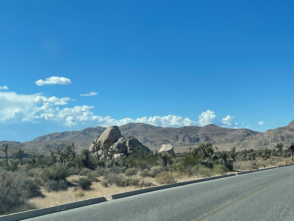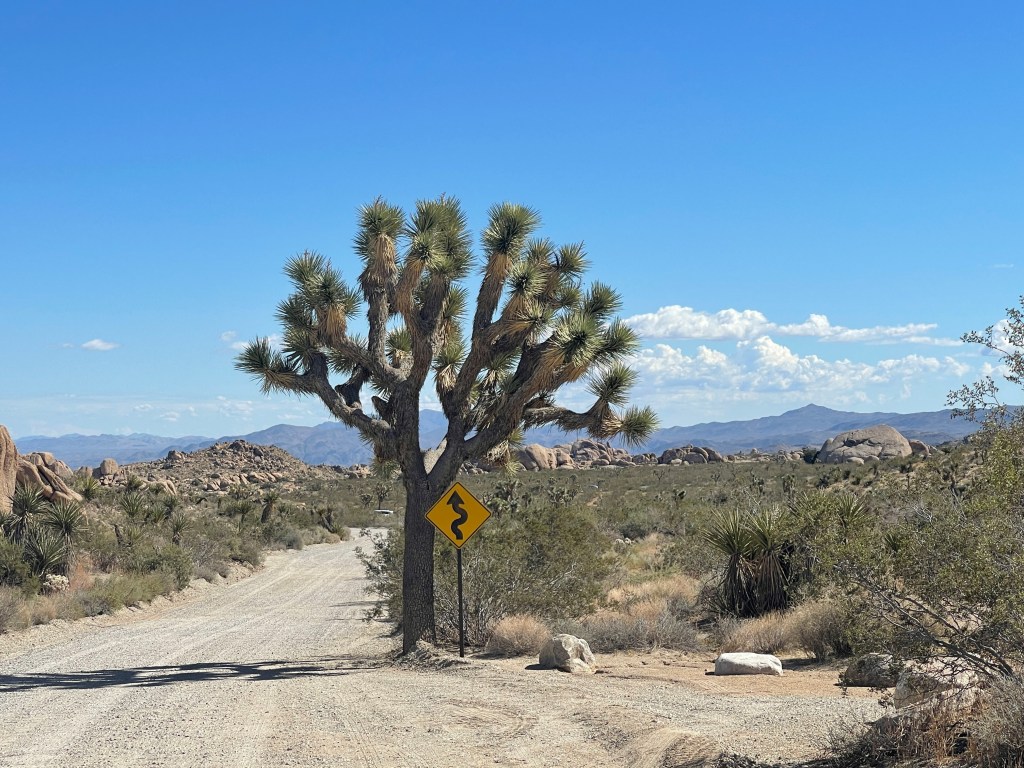 Finally we got through the worst of it and turned left from Highway 62 onto Highway 247, or Old Woman Springs Road, according to my map. That’s the name of the Highway 247 all the way to Lucerne Valley where all the dairy products sold at Safeways the world over come from even though there’s not a cow in sight.