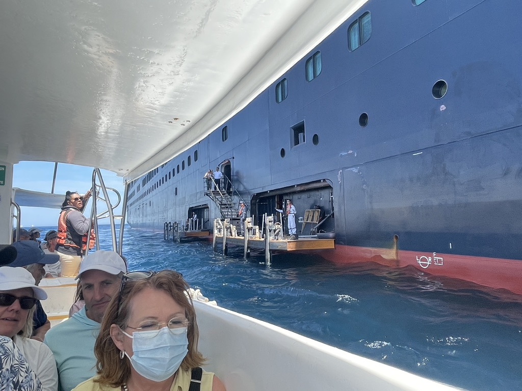 From the seaside, multi-level patio area of the restaurant we could see the ship at anchor.