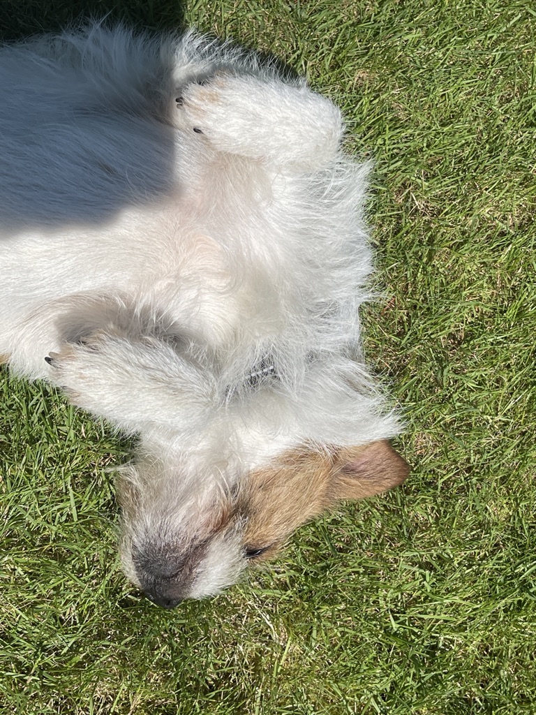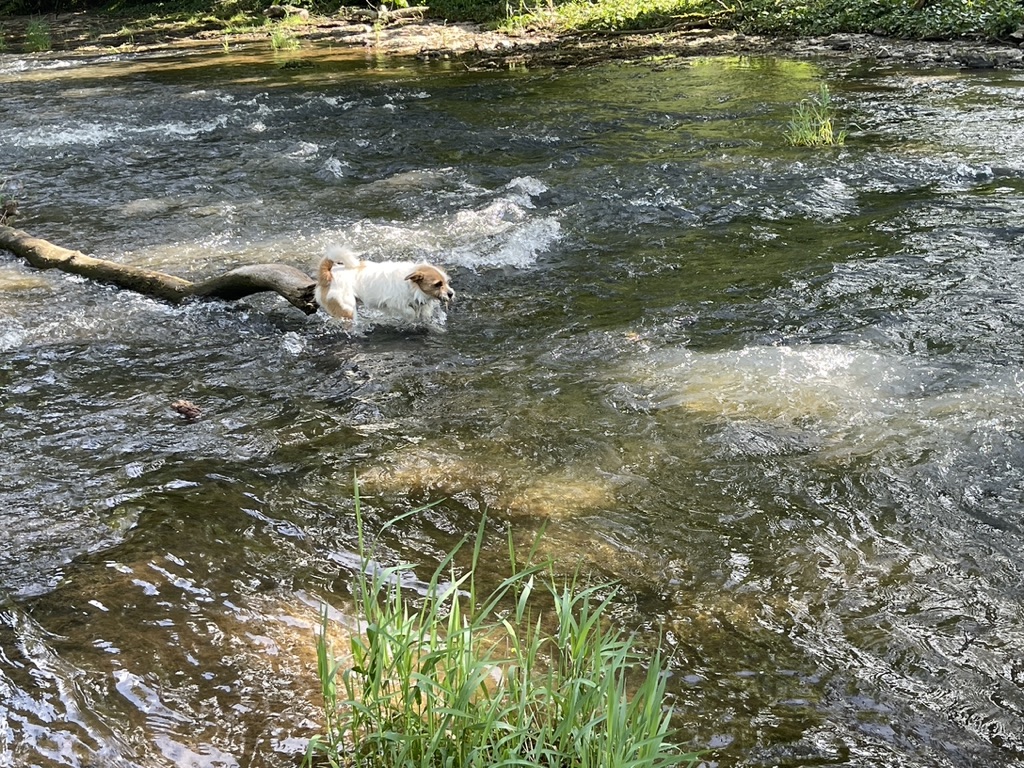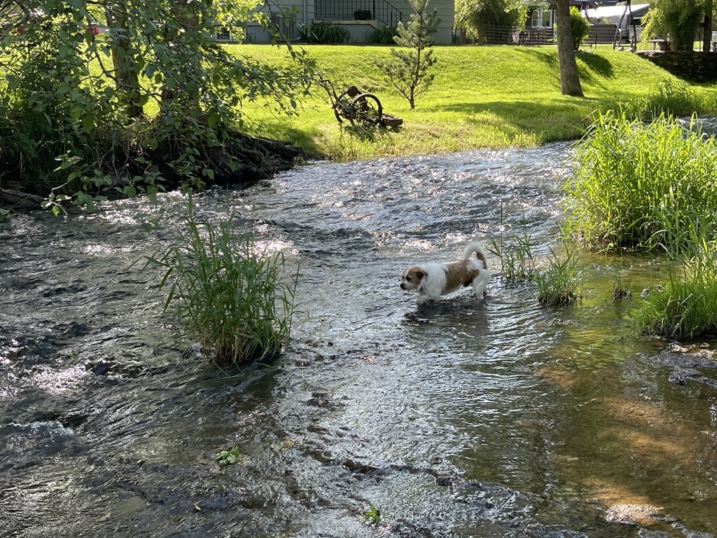 Now, let’s talk about the water issue. He kinda loves it and seems very pleased that a creek is running through his new back yard. He also loves mud puddles. Being mostly white, that’s a problem solved by a quick rinse in the creek. He doesn’t just walk through the puddles. No, he stops, turns around 3 times, then lays down ensuring he gets the majority of his little body covered in whatever lives in puddles. Then I take him to the creek where he wades out far enough to cover about half his height, then he lays down, facing upstream, leisurely lapping the water headed his way. Thankfully, he rinses off nicely. That’ good because our chosen pet groomer can’t see him for another month or so. By then, he’s going to be a mess.
