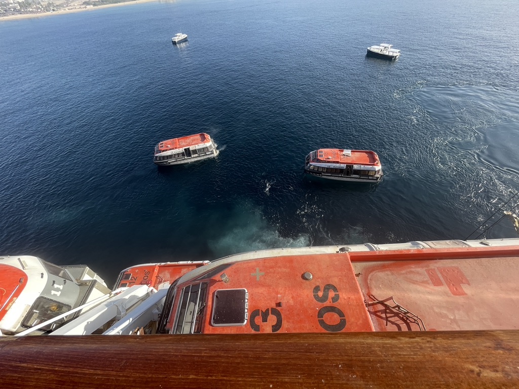We arrived at our anchorage around 0700. Sadly, there’s no place to park this big ship inside the port so we had to anchor offshore and use boats to go ashore. They call them tenders at times like this, but they are really lifeboats. I know this is true.