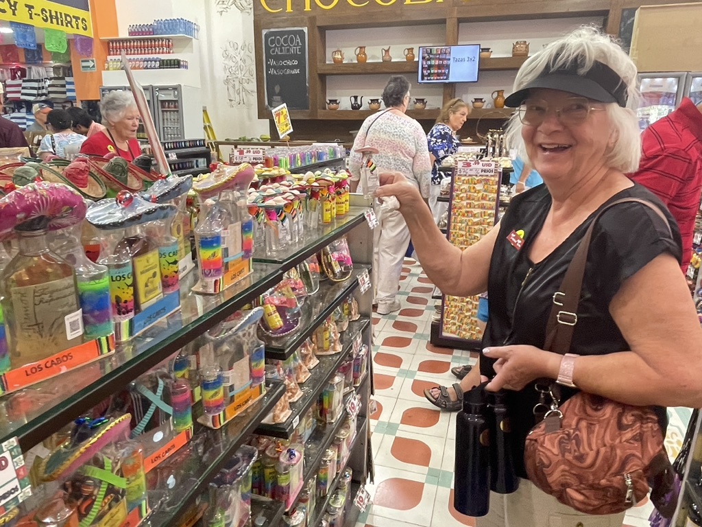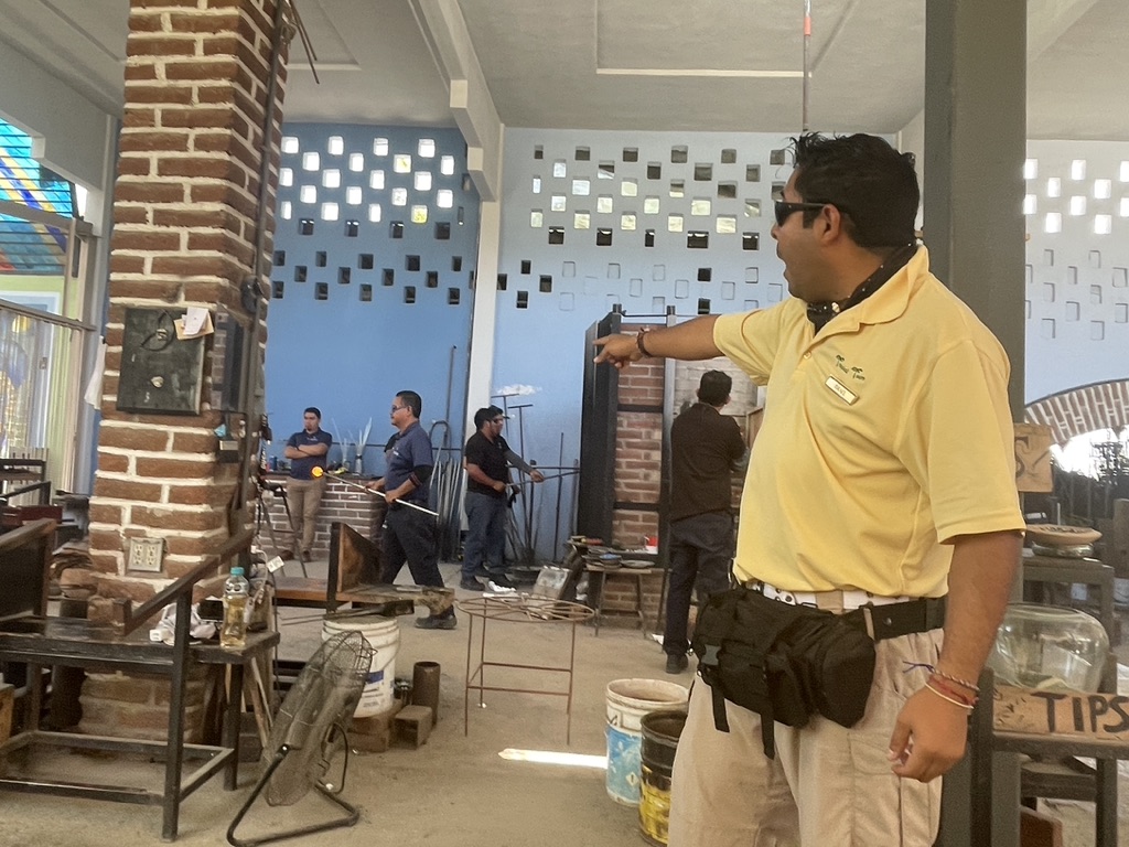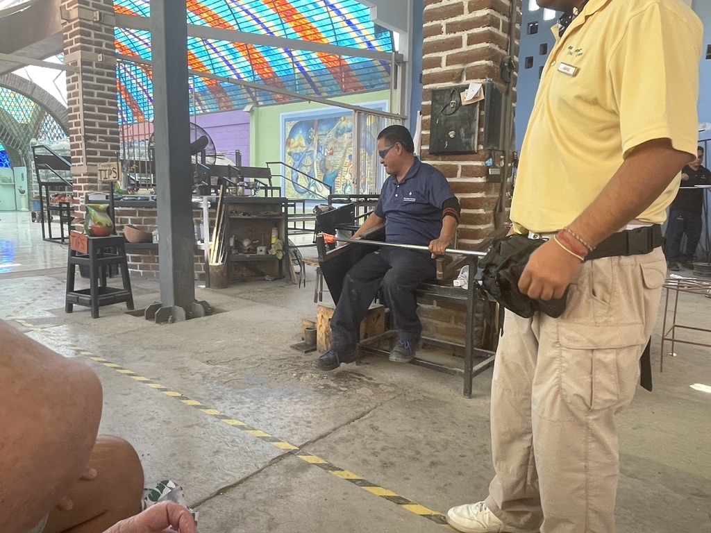 We were driven back to Cabo but before going back to the ship there was one more stop, at a “blow glass” business. A friend of Israel’s works there and it’s apparently a regular stop. In addition to watching the workers, about 10 of them, scurrying around with molten glass on a metal rod, one of them sat in front of us and created a turtle with a sombrero and a bottle of tequila in about 10 minutes. It was impressive. Another worker brought him different colors in a choreographed manner so he didn’t have to get up and get it himself. It was fun to watch. It was interesting to learn that this facility does not make glass. They recycle it.