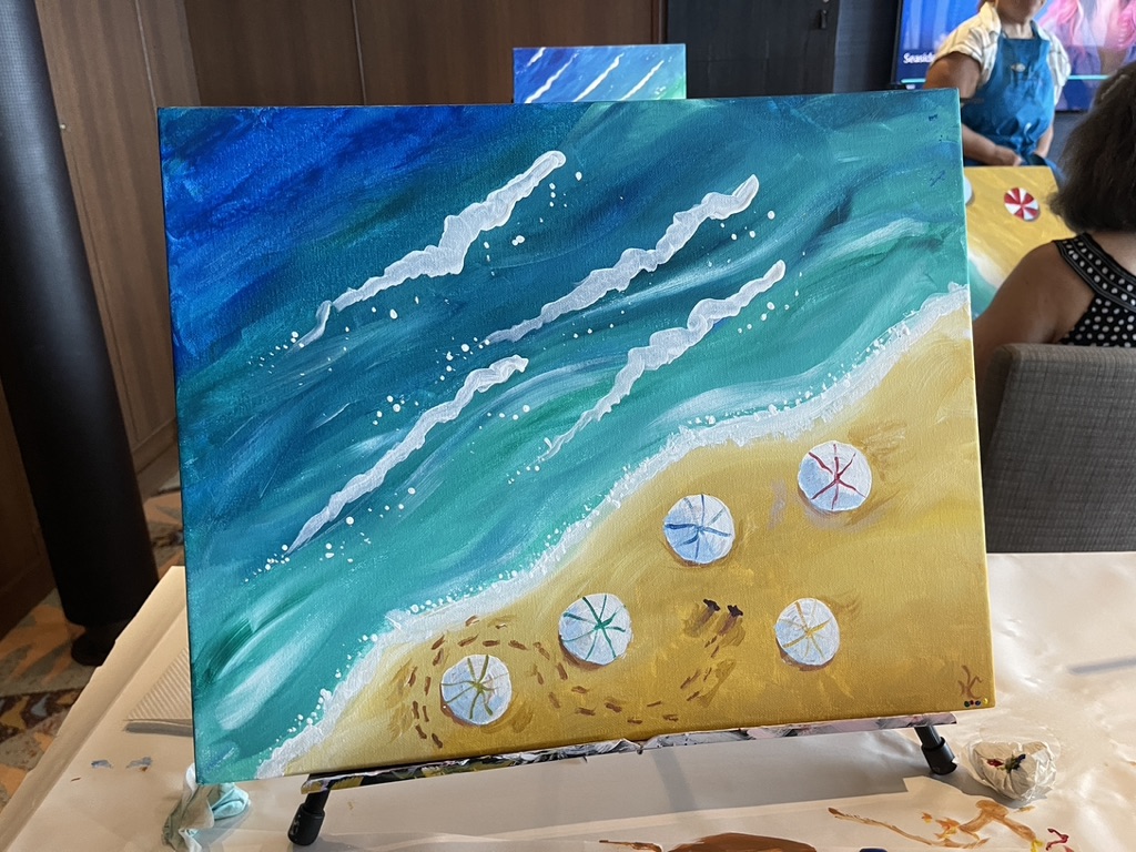 I have to add that before we put any paint on the canvas we had to load a paint brush with a bunch of paint. Everyone was wearing an apron, provided by the ship, which proved to be very fortunate to the lady sitting next to me.