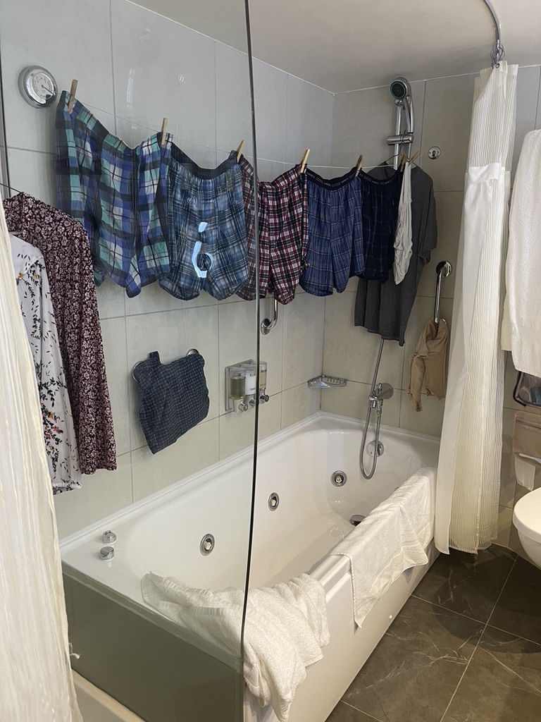 As you can see, our suite had a jetted tube that works almost better than an agitator. Rinses everything pretty good, too. Sadly, although the air circulation is really good, it’s not enough to dry things like this. It took a couple of days. As you can see, most of the clothes are mine. That’s only because she insists that I change my underwear every day. I keep telling her that I have a method that makes wearing a pair of underwear for four days. She’s not a fan, however, so I swapped them out daily. I brought 20 pair and she still found a reason to wash the old ones anyway.