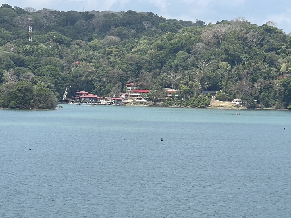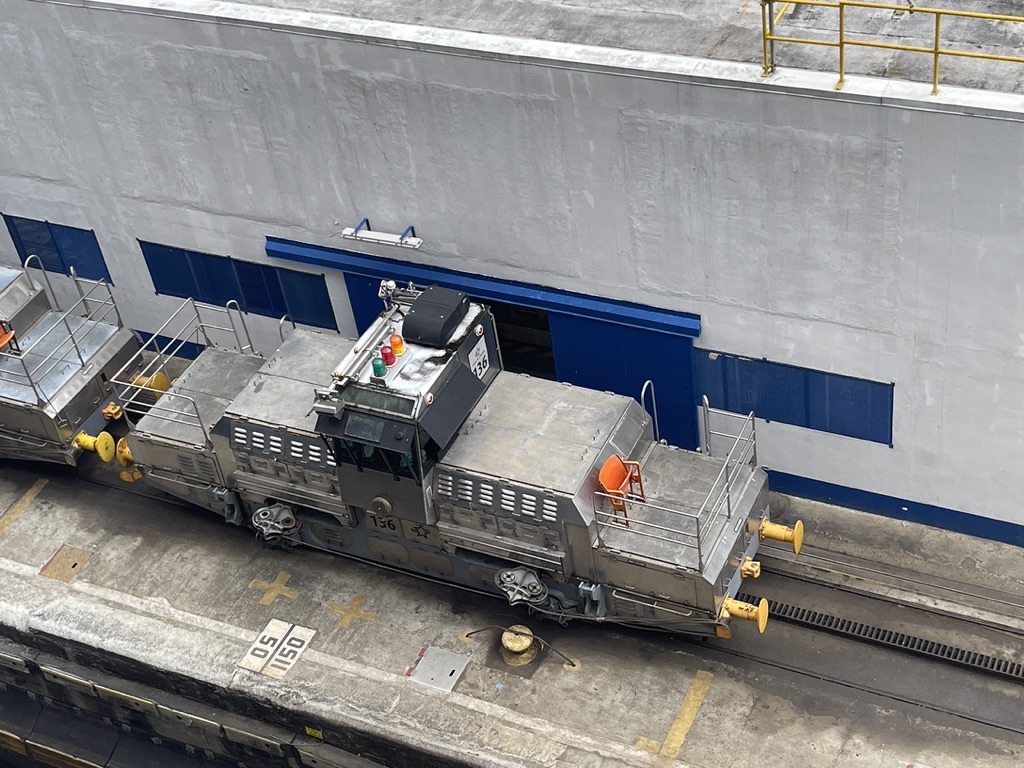 We finally hit the third lock and were turned loose on Lake Gatun. In the above photo you can see the railroad tracks on which the locomotives ride. There are one on each side of the ship, fore and aft. The ship propels itself through the locks and the locomotives job is to maintain the ship in the center of each lock as the water level is changed, up and down. It’s quite a ballet of machines because our ship had 2.5 feet to spare on each side making those little locomotives an important piece of the puzzle. They did a good job.