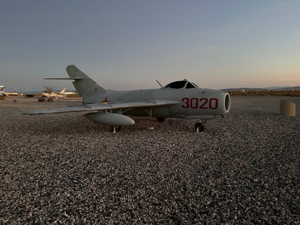 I didn’t get photos of the fighters during the day but did visit the flight line museum which is a static display of many aircraft, including Russian MIGs. But first, here’s an old COG plane that used to be on the USS Nimitz.