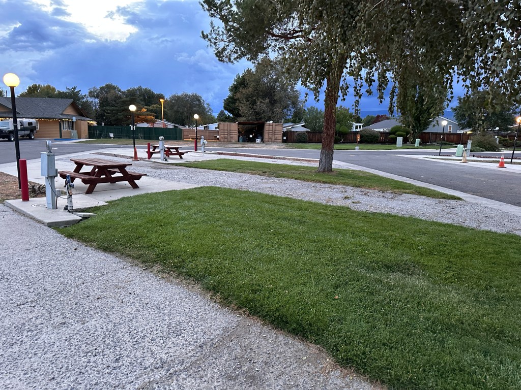 We finally made it to the Friendly RV Park in Weed and managed to get connected to #14, their biggest space, by 1600, or thereabouts. The Duck game had been in progress for an hour but that was OK because it wasn’t broadcast on Dish anyway. So, we just logged into the local wifi and got updates on the game. Oregon won 42-6.