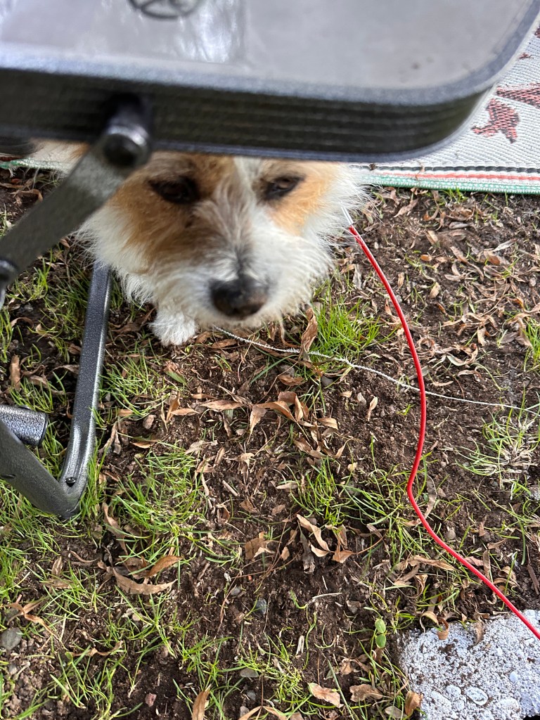 I’m not sure he figured them out because I put a halt to his efforts, explaining to him that it’s not nice to dig holes in state parks. As a matter of fact, I think it’s illegal. When I explained that to him, sharing the possibility of jail time, he demonstrated a contrite attitude, hiding under the table on my chair, in hopes of avoiding an arrest on his record.