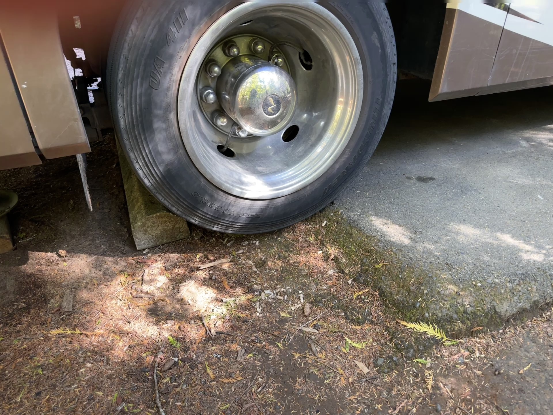 I got out the big blocks Jeff made me and placed them under the rear jacks hoping they wouldn’t get jammed into the soil too far before they got the rear wheels off the ground. I started the leveling process and then went back to watch the results and was gratified when the rear wheels left the ground. My plan was to get some pieces of wood to slide under the wheels to keep them elevated when the jacks were retracted. Not having wood, I rediscovered the plastic leveling pads that look like large legos and used them instead. I wouldn’t know how effective they would be until this morning when we broke camp. I’m happy to report that they worked great. There was a little hesitation getting the umph to regain the paved area, but it made it.