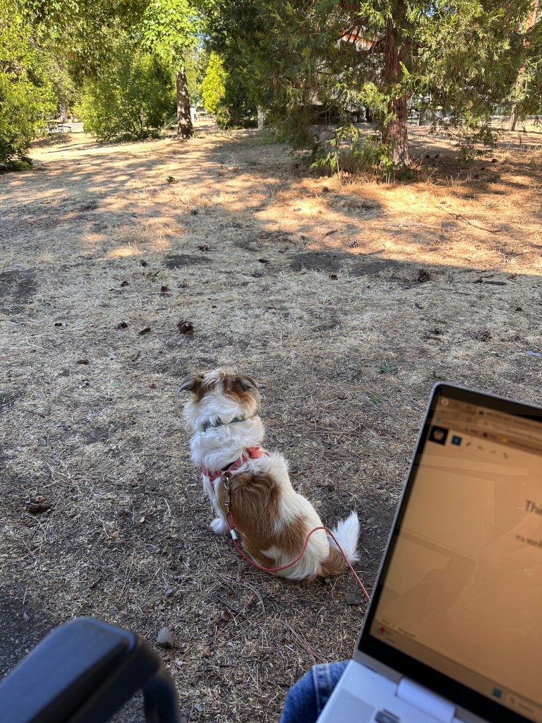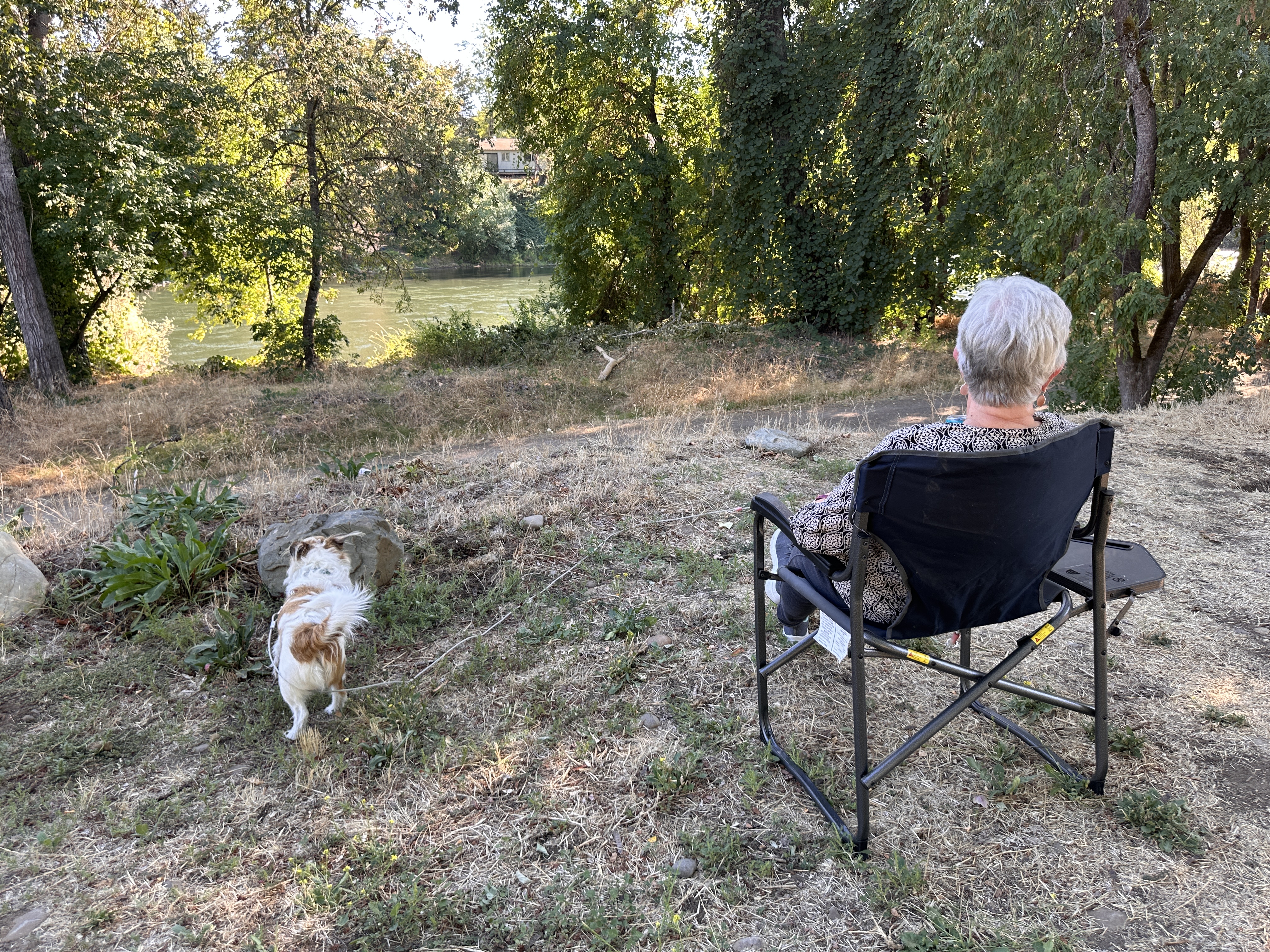 Now it’s 1045 and I’m sitting outside the RV at a picnic table to keep Max company as he checks out his surroundings and keeps an eye on folks coming and going past space #2. He doesn’t bark. He just watches.