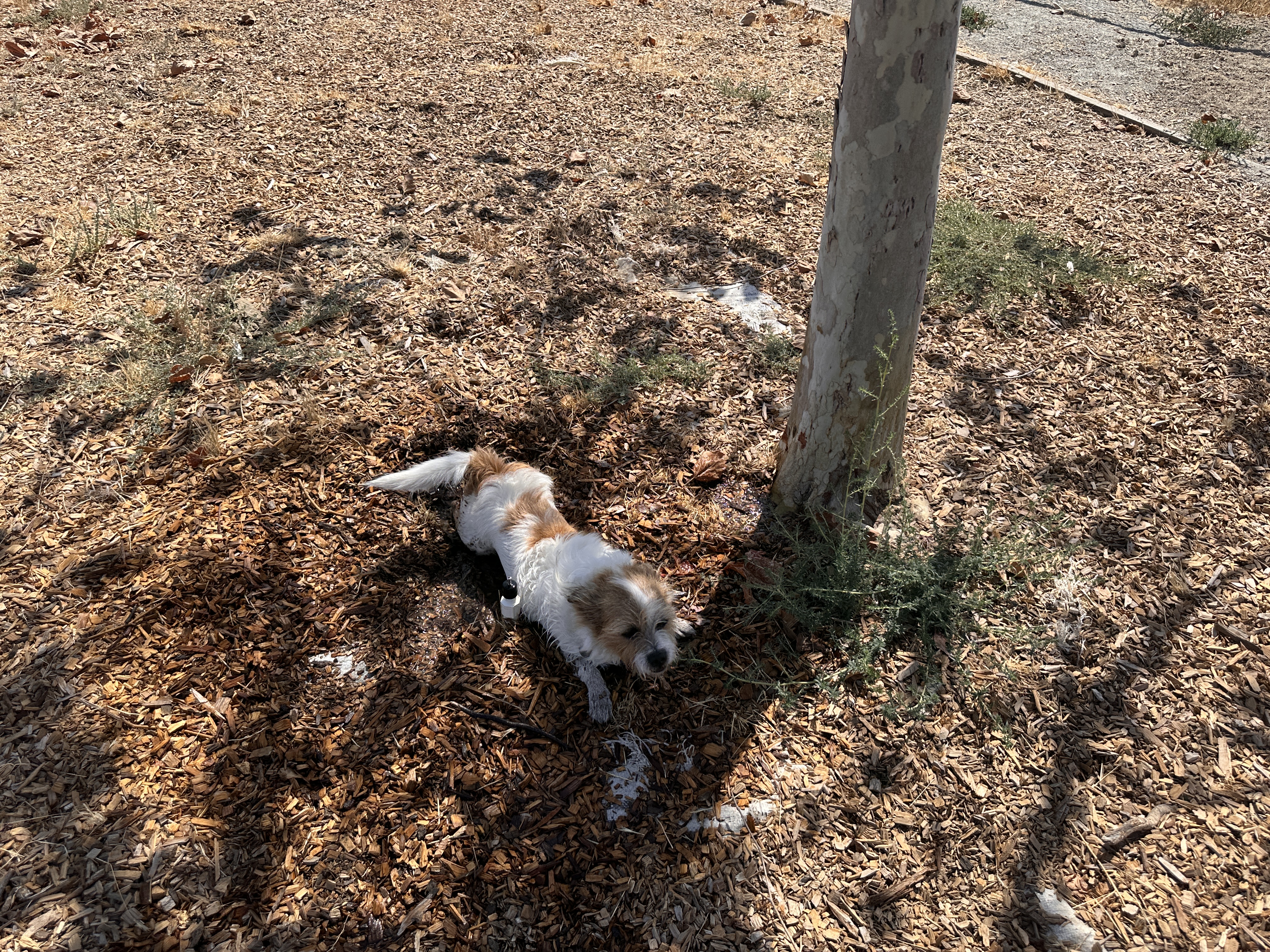 Yesterday the heat was grueling sand Max was totally done with lounging in his little throne. Luckily, there’s a dog park next to the forest or landing pads so I took him there and turned him loose. Just as we got to the park a gentleman was leaving and he apparently turned on some sprinklers in the Small Dog area of the park and Max was ecstatic. He found a sprinkler that was making a puddle, dug out around it to make the puddle bigger, then layed down in it, happy as a clam. Almost like cooling off in the crick at home. This one, however, was muddy, but he’s proven that he’s not afraid of a little mud. Consequently, he got very muddy.