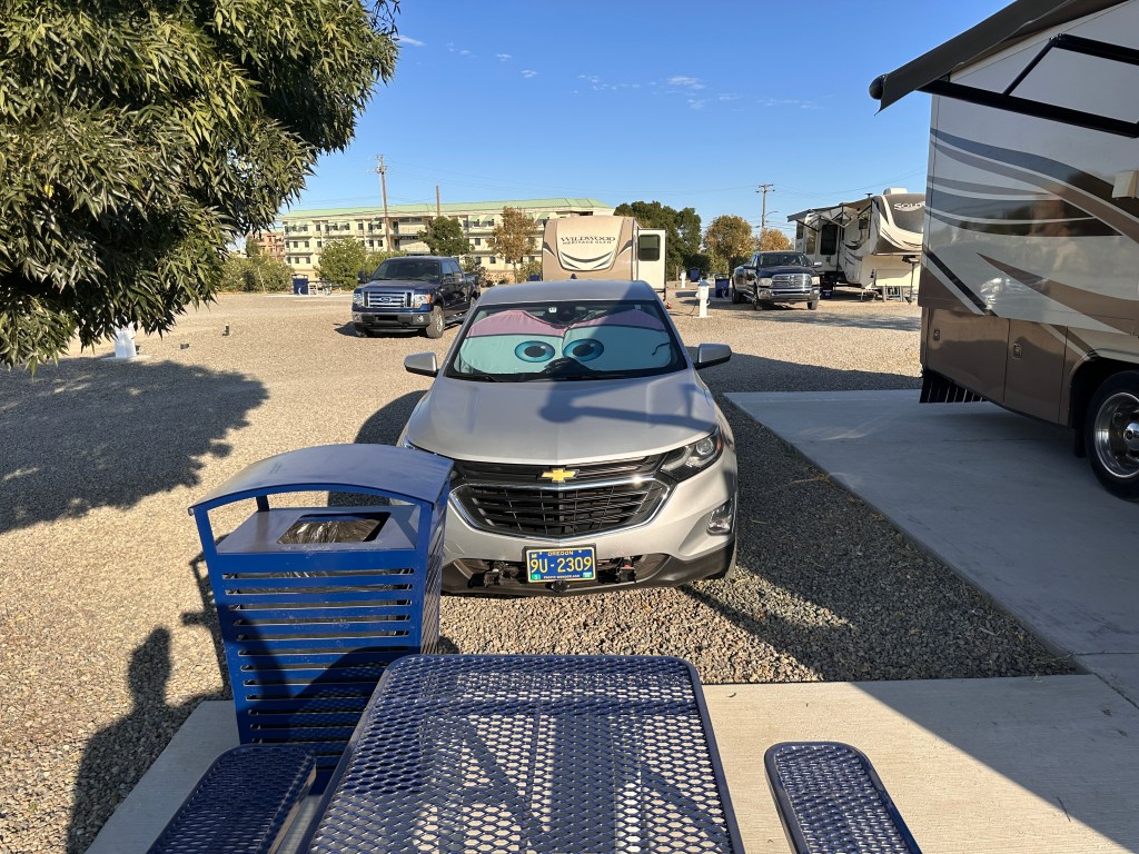 We drove around a while with no luck because there weren’t any signs telling us where to go. So, I parked in a very large, empty parking lot and released Diane to search our surroundings. She returned about 1/2 hour later with good news. I followed her to the RV park and she led me pad #25 where I parked perfectly the very first try. It was simple because every space as a cement pad large enough to accommodate the largest RV in existence. I know that’s true because one of them was parked on pad #26.