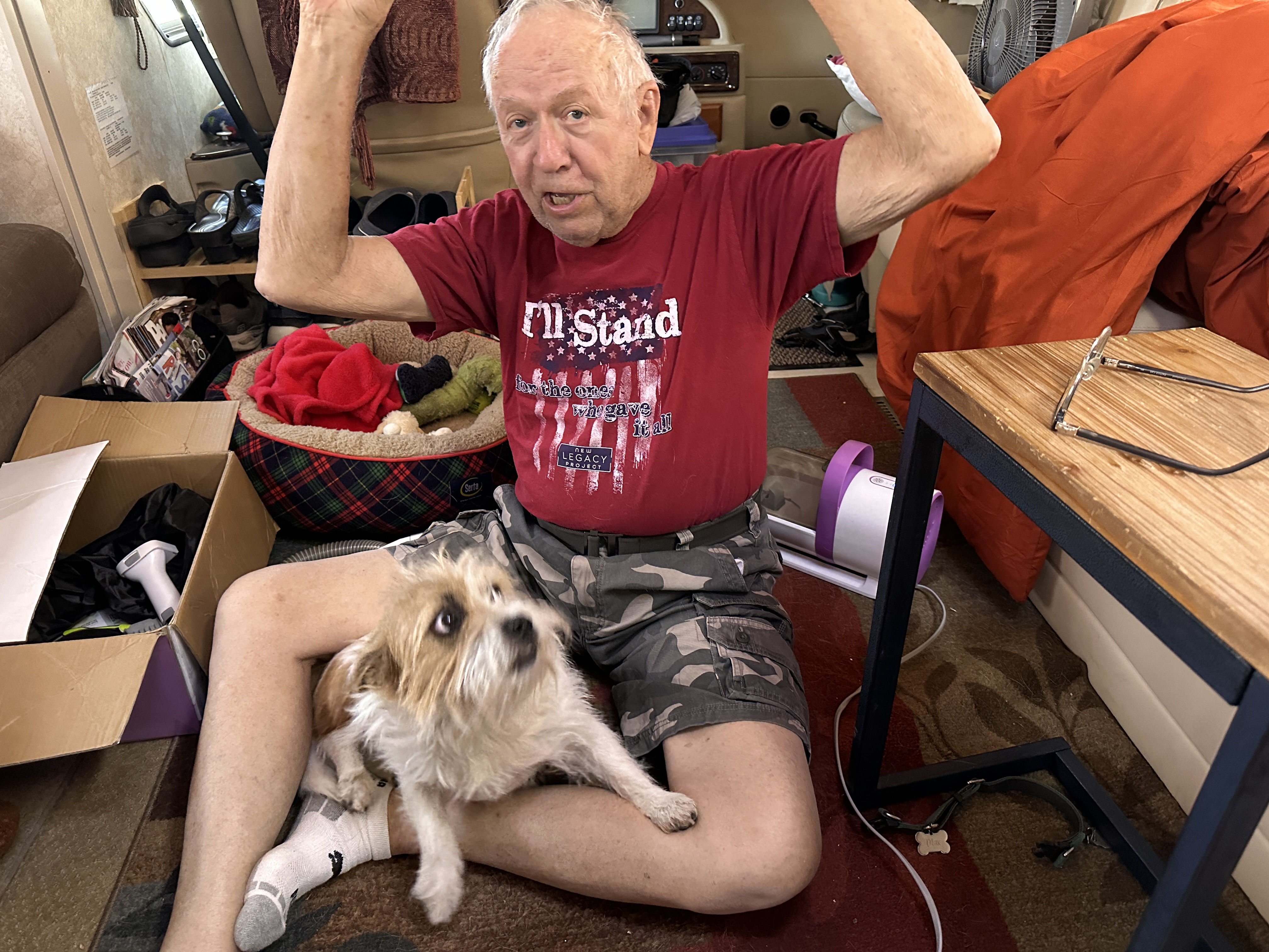 I did my normal morning routine to get my breakfast which is mainly to be quiet like a mouse, but that never works out. Something always makes a racket which Diane can easily hear. Thankfully, she doesn’t complain about it. Honestly, I think she’s OK that I make a little noise because by doing so she is reassured that I’m alive and moving. Even then I think in the back of her mind she’s prepared to hear the heavy thud I’ll make when I land on the floor for any reason. So far, that hasn’t happened. I practice that move when Max and I are home alone. Yes, I practice falling in the RV as quietly as possible. That’s kind of lame, I know, but what the heck. Gives me something to do. What will most likely happen is I’ll fall off the stairs leaving the rig and I’ll land on the gravel. I doubt if she would hear that so now I need to train Max to start barking when I fall to get attention. I tried to teach him to run back in the RV to the bedroom to bark, but he wanted to stay with me. Teaching him to bark is a challenge because when he does it voluntarily, he gets scolded a little. So, the best bet is for me to just lay where I land and wait for someone to show up.