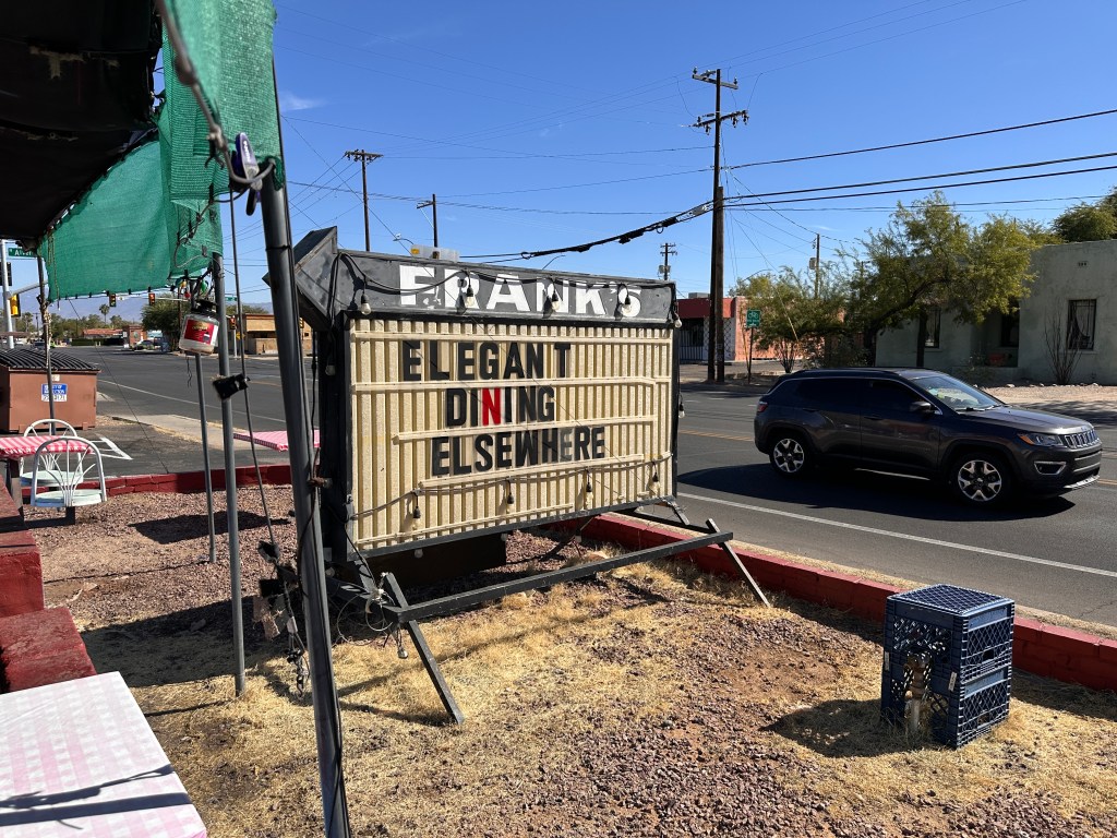 While Diane was visiting the 2nd store Max, and I stayed in the car and did some research about lunch. The one I found, Frank’s, was right up our alley. Here’s his reader board out front: