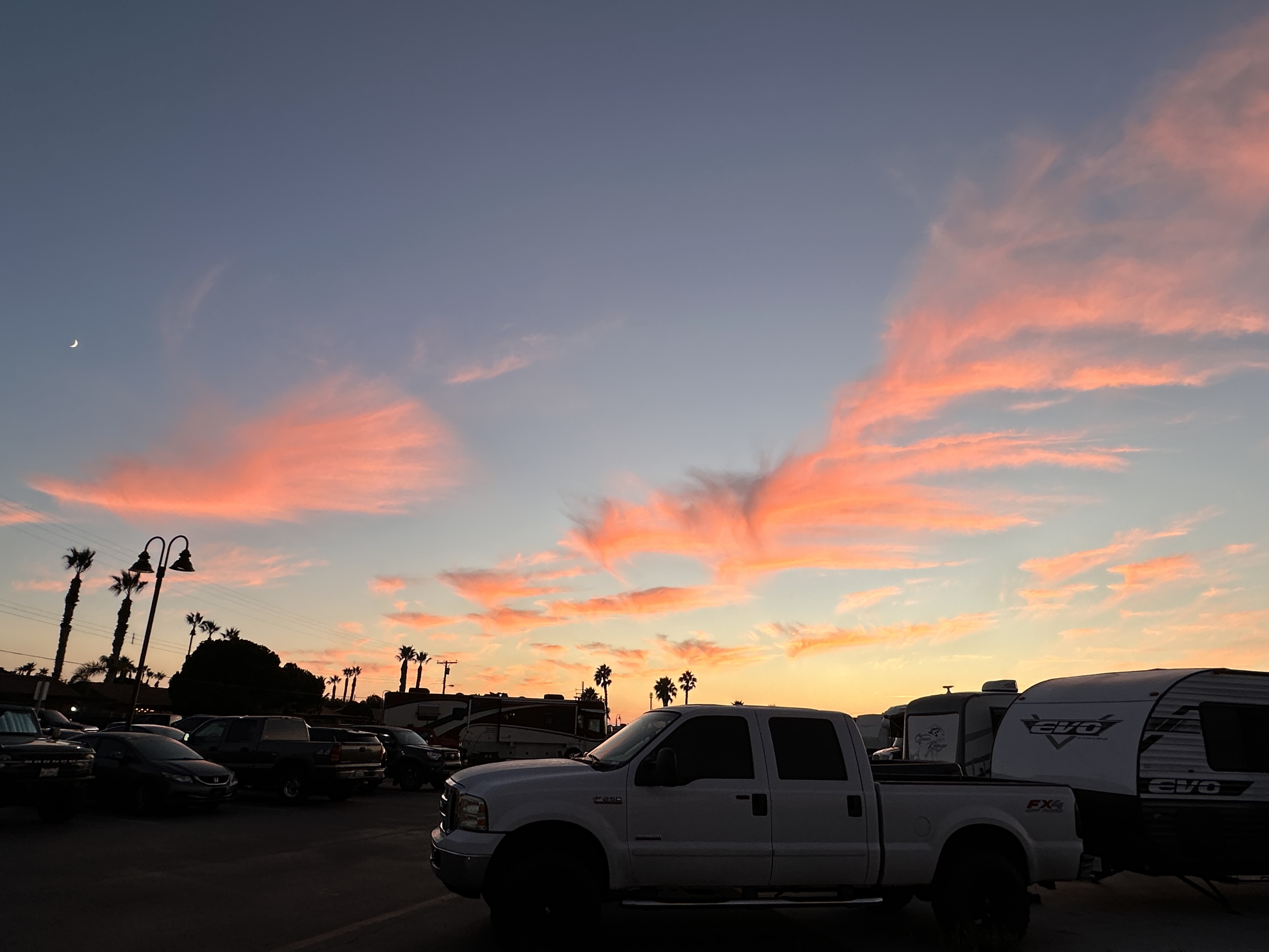 Then, after hooking up the car, we embarked on the next challenge, driving up Orange Avenue through downtown Coronado to 4th Avenue, then across the Bay Bridge to I-5. Sounds simple, right? Well, it wasn’t all that easy. First, Orange Avenue isn’t all that wide when you cram two lanes of traffic between rows of parked cars on each side most of which actually parked close to the curb. That means those who didn’t create the need for drivers in the lane next to the parkers, to jog out once in a while. Not too tough in a car, but driving an RV makes it a challenge. You’ll be happy to know that we made it OK. We also made it down 4th Ave and across the bridge, transitioned to 3 or 4 different freeways until we finally wound up on I-8 East. Whew! Pretty exciting stuff.