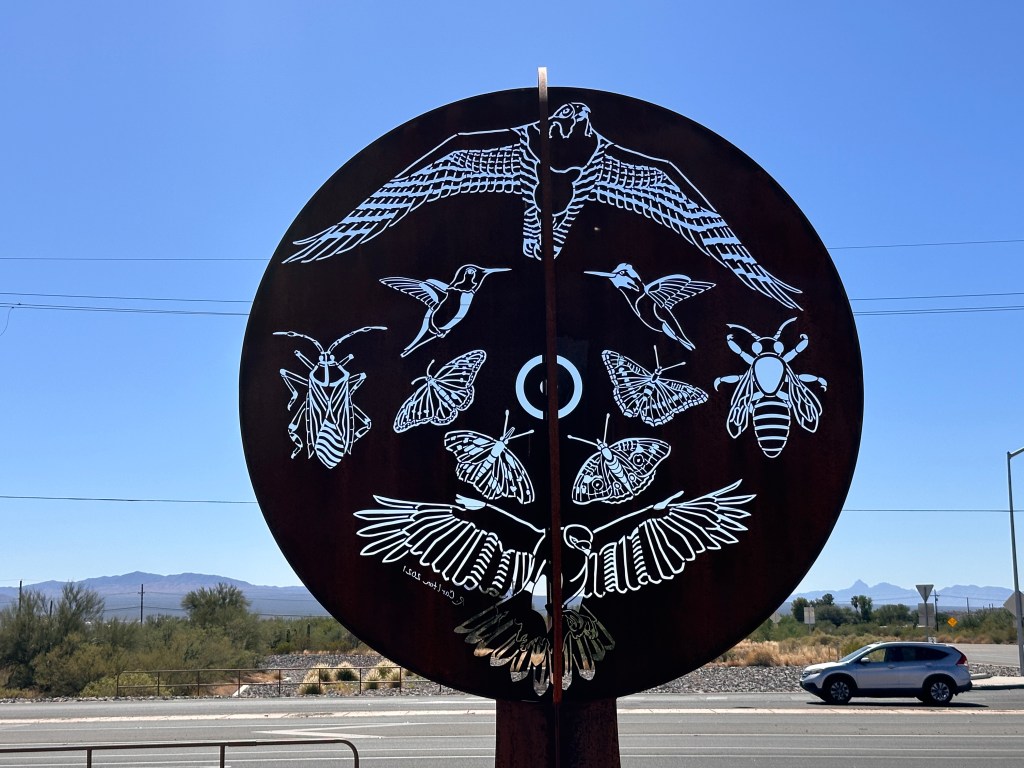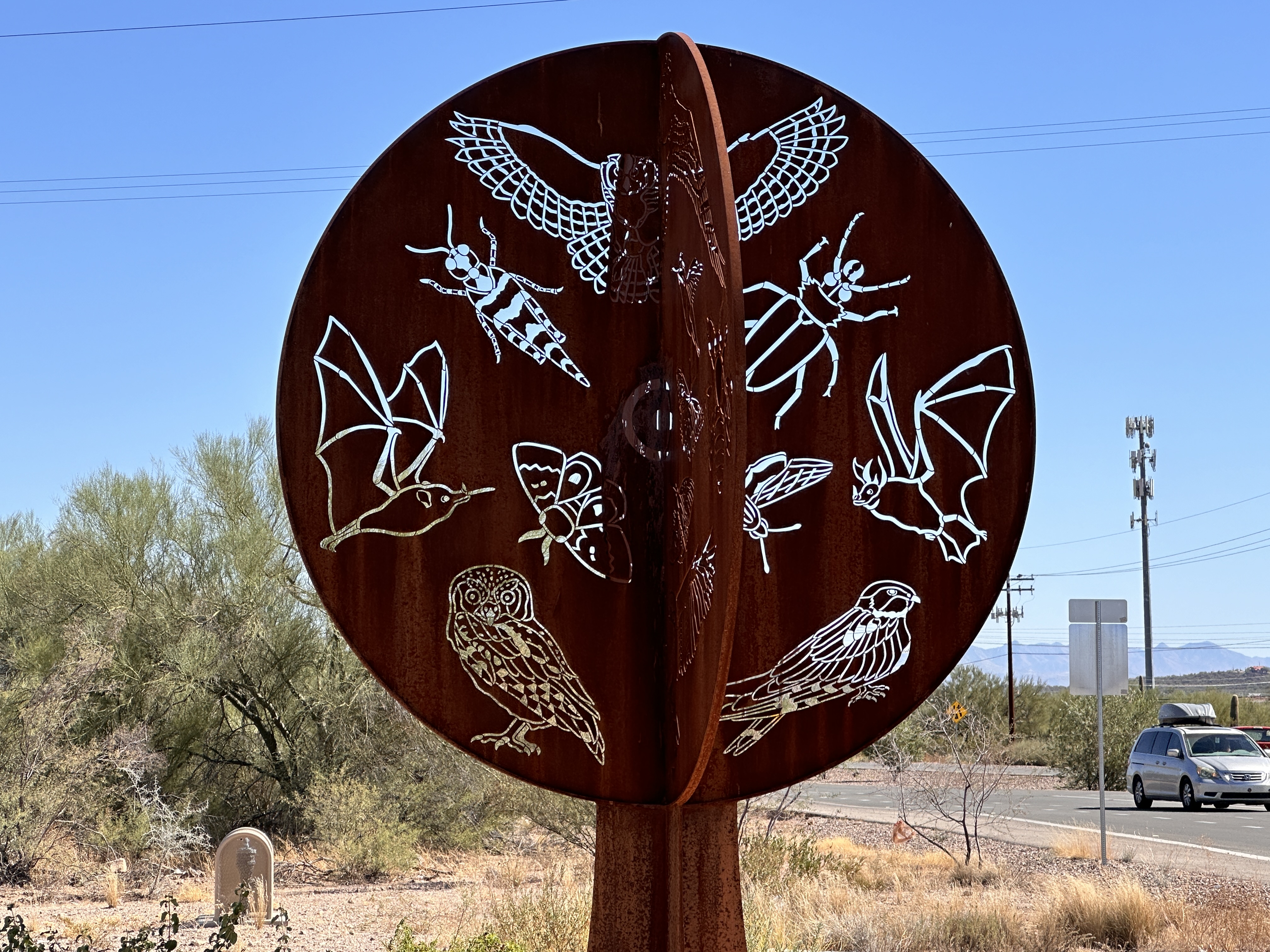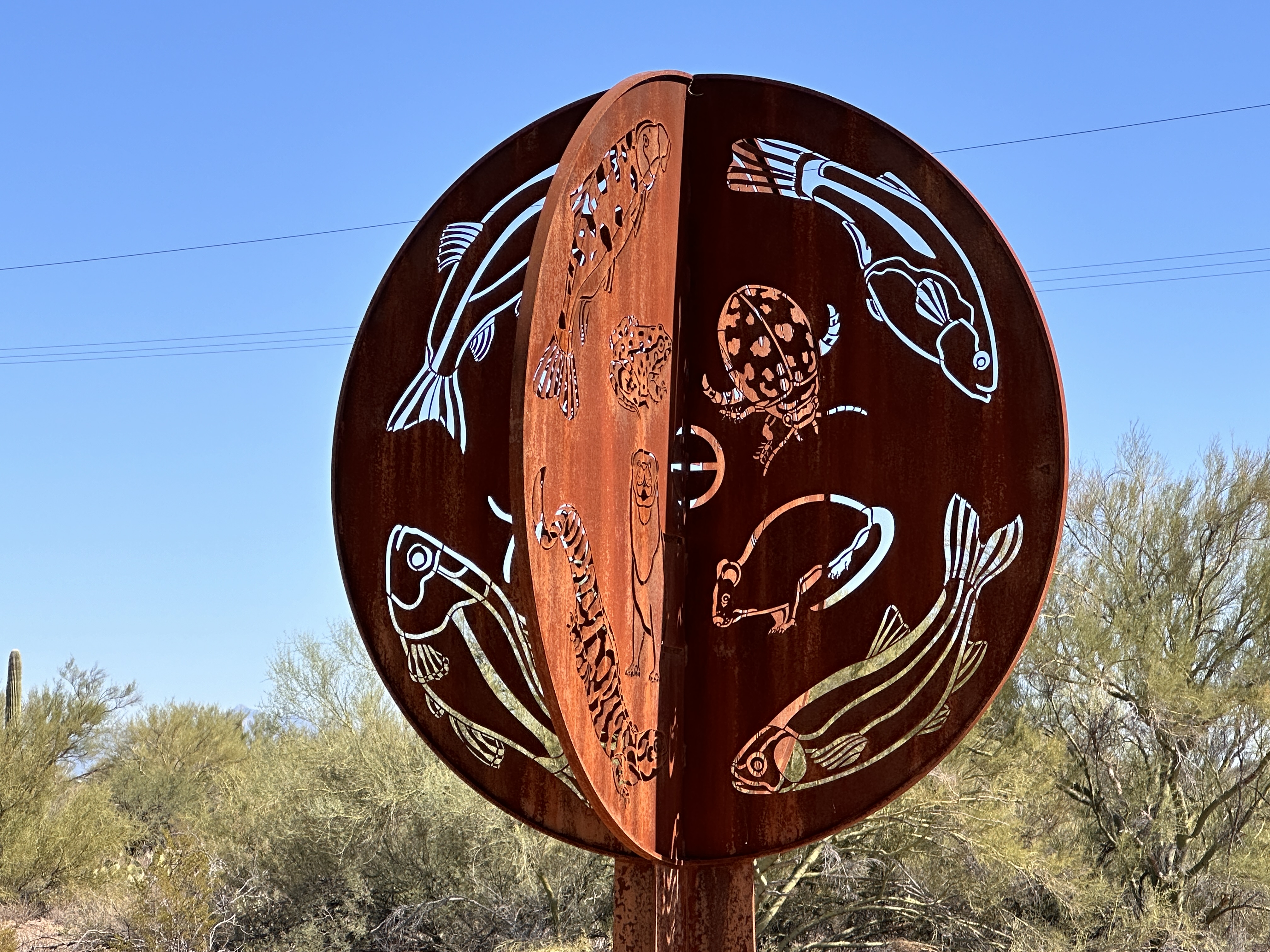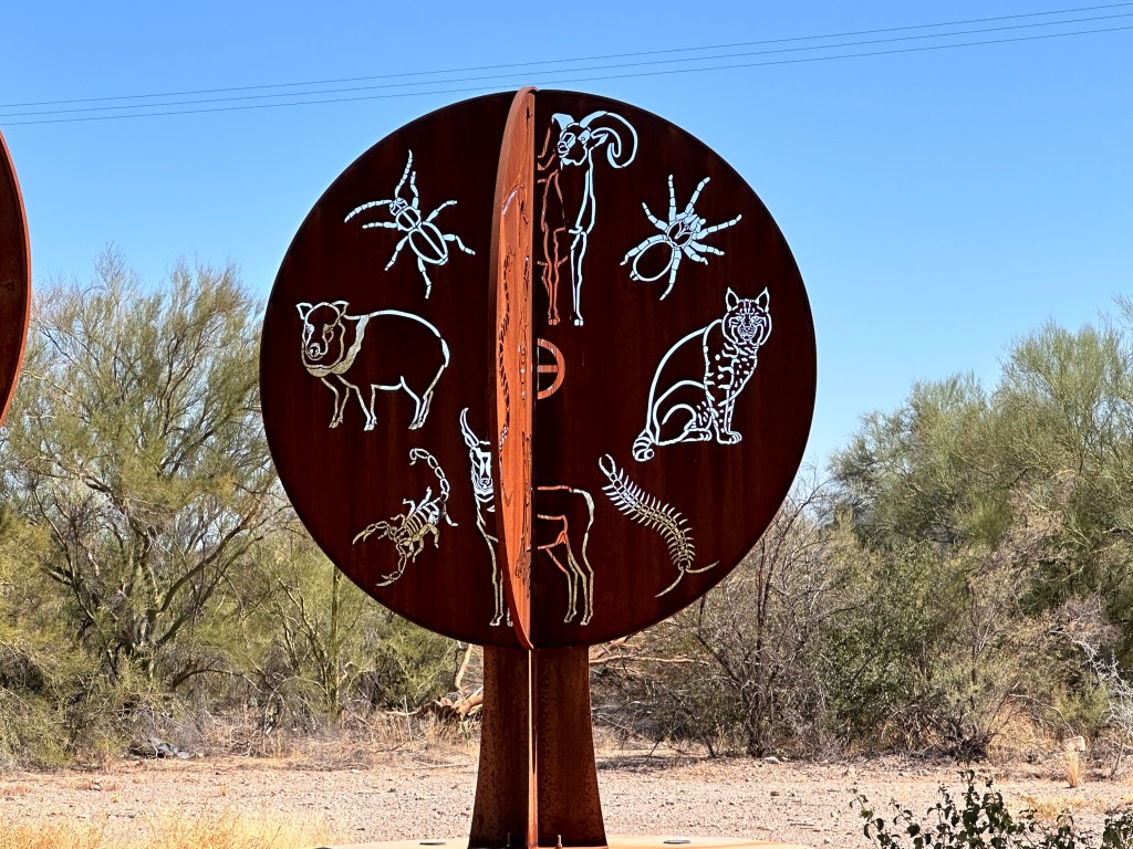 While on the mountain yesterday, we came across this display of large metal discs displaying pretty much all the animals and fish Arizona has to offer. They were laser cut and each of the three pieces of art were comprised of two intersecting discs. I walked off the road through some questionable vegetation and stood in the afternoon heat to get these for you so hope you enjoy them.