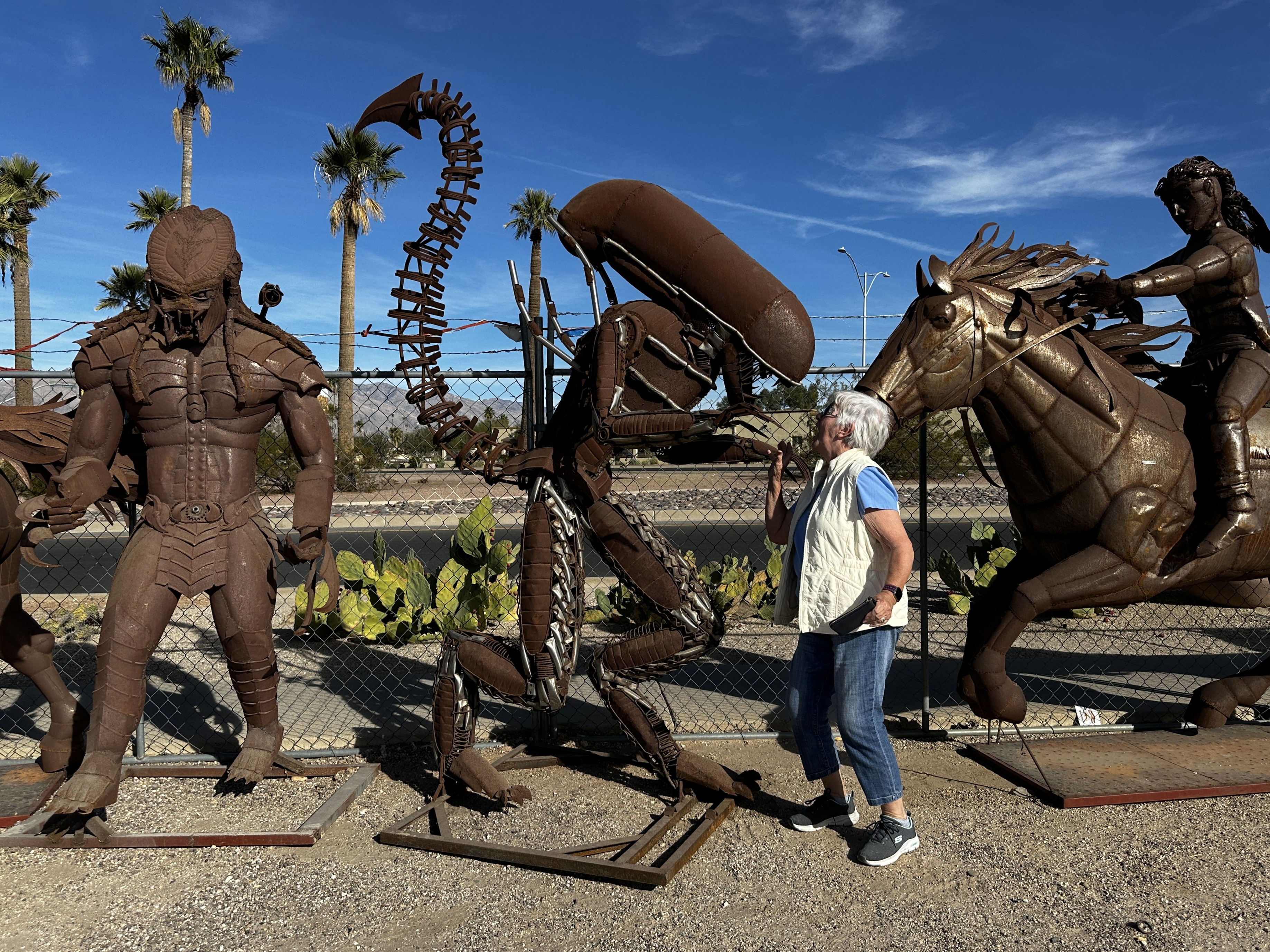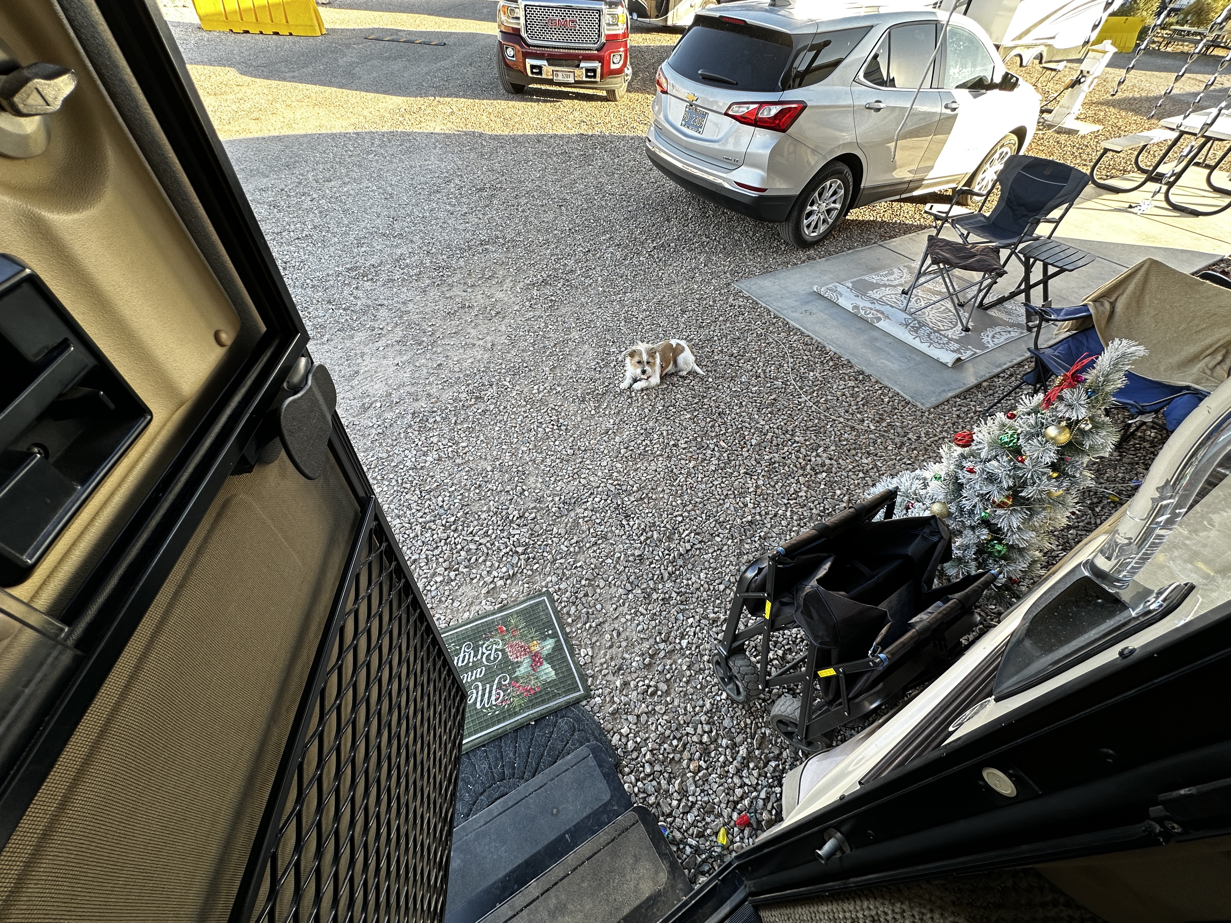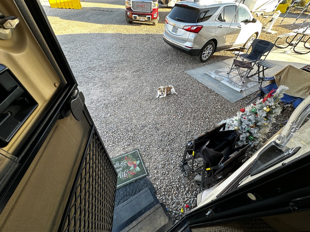 With the door closed it was extremely difficult for me to access the inside portion of the door. Thankfully, I had the driver’s window open so could Max visit with the neighbors when they come and go. I got the ladder I purchased somewhere in California, after losing it in the Valley of the Rogue RV Park when I went over an exceptionally tall speed bump, and used it to climb in the window.