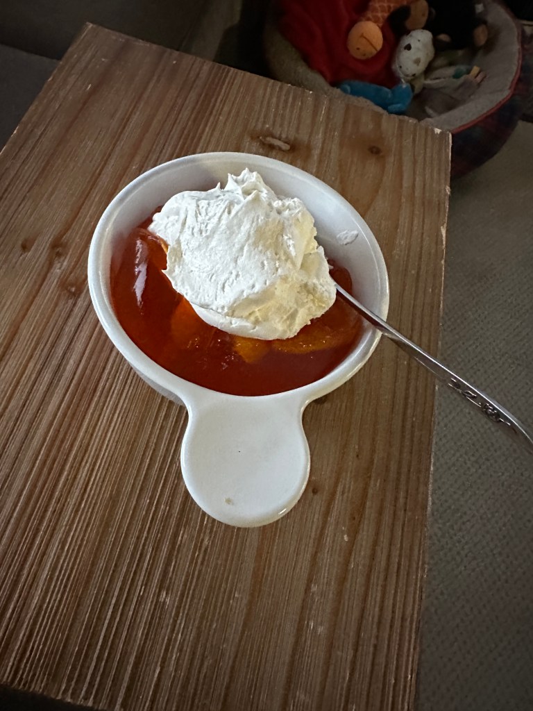 Orange Jello, with pieces of mandarin orange pieces randomly scattered throughout, and half a pint of cool whip: